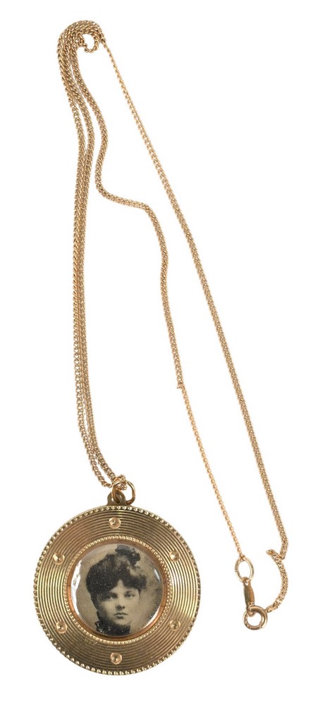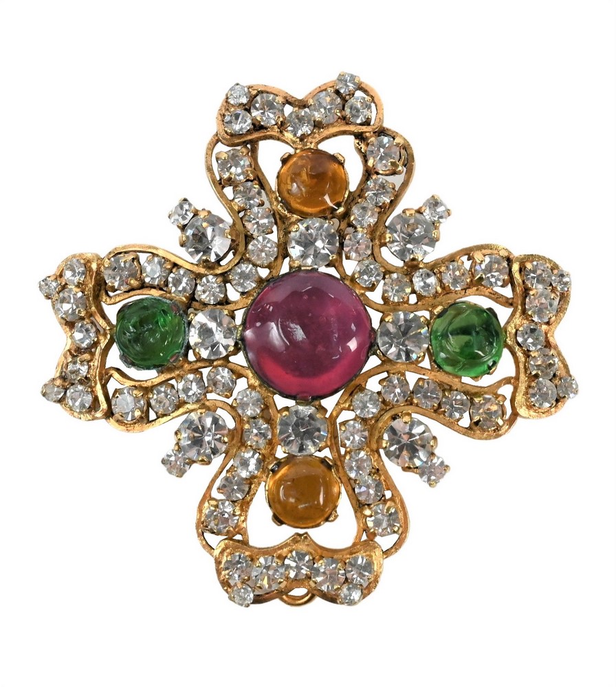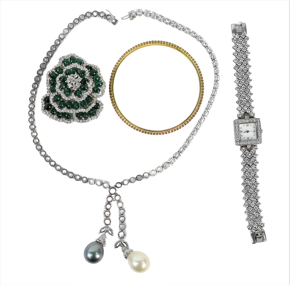 Three Piece Group of Costume Jewelry, to include M.C.J. green stone and rhinestone brooch, diamond simulant ladies watch, along with a diamond simulant necklace having pearl drops, pin diameter 2 1/2 inches.