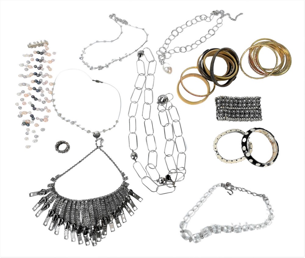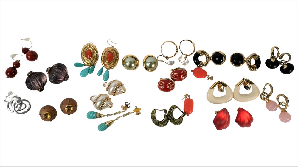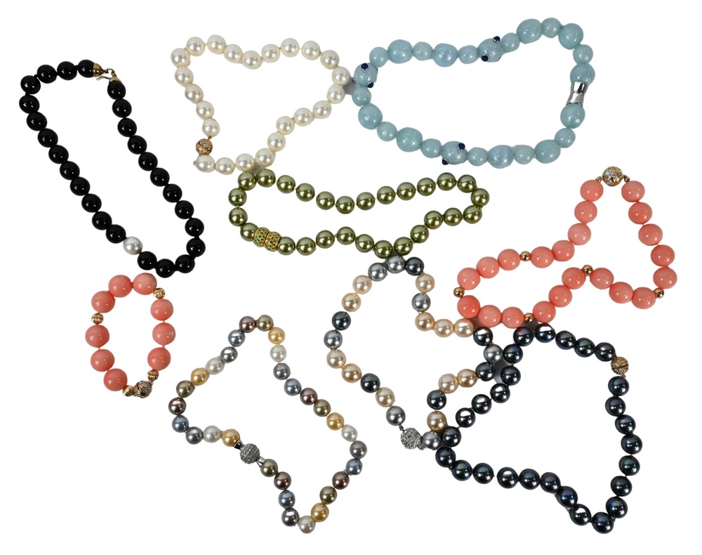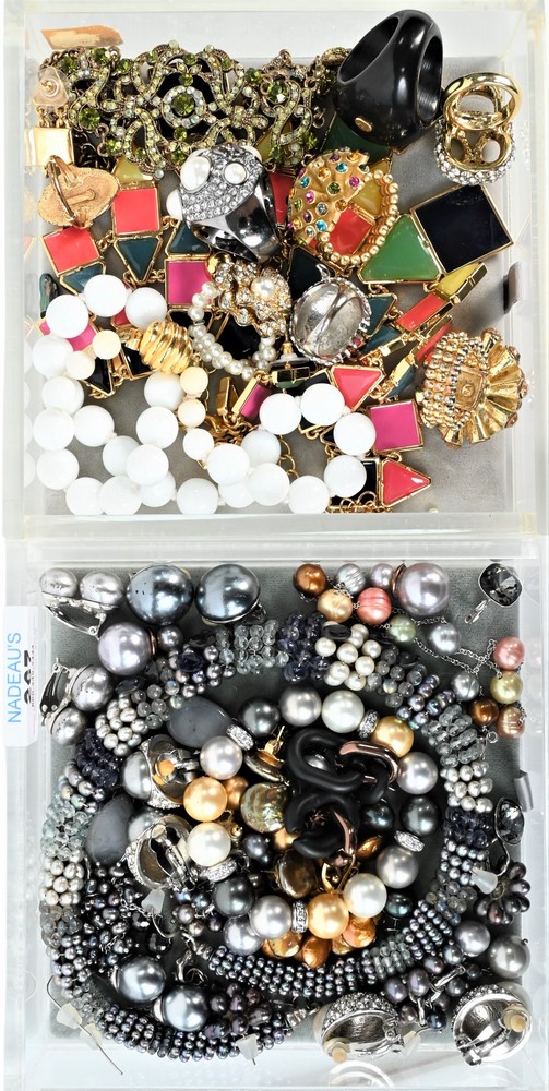 Group of Assorted Costume Jewelry, to include Kate Spade enamel necklace; Replica; Christian Dior; three pairs of Erwin pearl earrings; pearl necklace; skull rings; along with a choker with gem stones.
