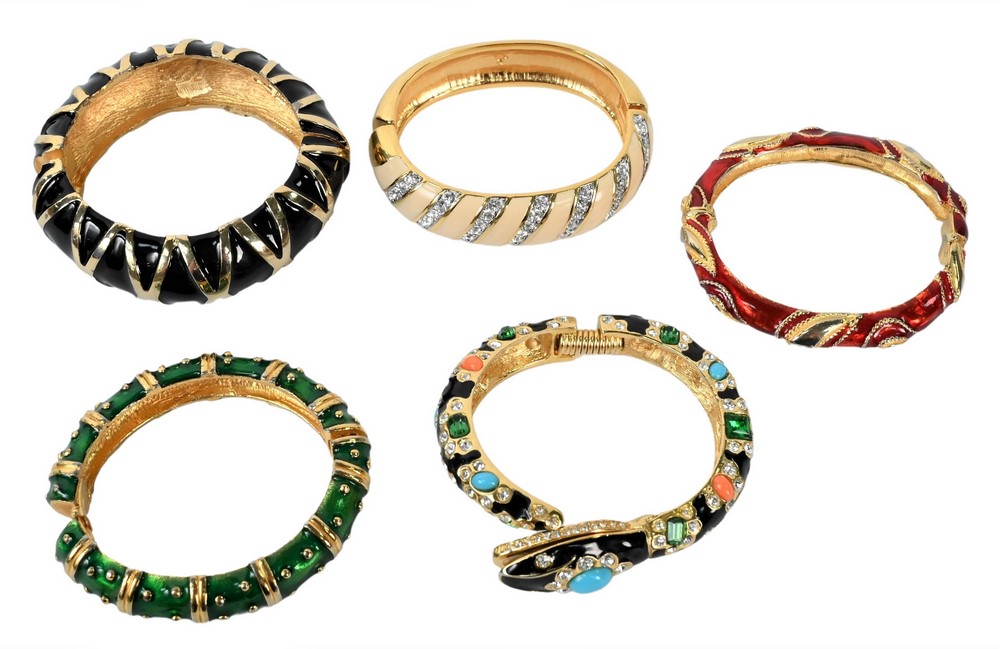 Group of Five Enameled Bracelets, to include Kenneth Lane enameled snake bracelet, green enameled bracelet, NLH enameled bracelet, white enameled bracelet and one black and silver enameled.