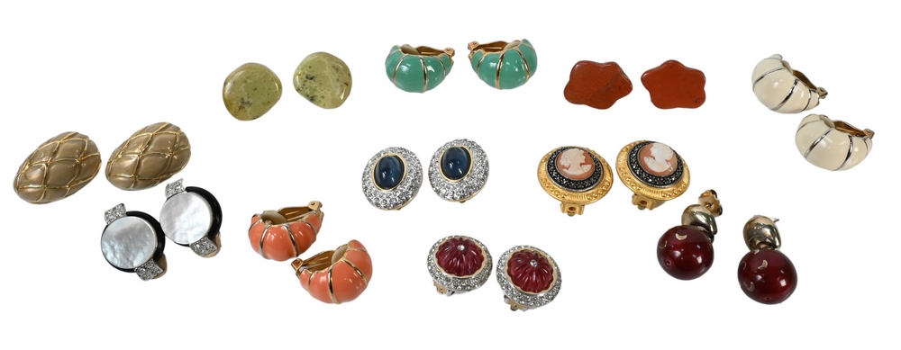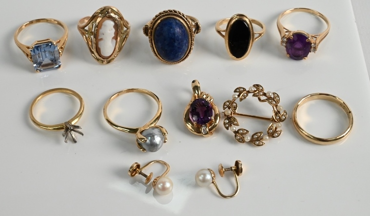 Group of 11 Pieces of Yellow Gold Jewelry, to include 10 karat yellow gold ring set with a cameo; 14 karat yellow gold ring set with aquamarine; 14 karat yellow gold ring set with amethysts flanked by two diamond chips on each side; 14 karat yellow gold ring set with black Onyx; 14 karat yellow gold wedding band; 14 karat yellow gold pendant set with amethysts and two diamond chips; 14 karat yellow gold and pearl ear clips; 18 karat yellow gold engagement ring setting (no diamond); along with three yellow gold pieces with marks worn away, to include two rings along and a brooch; 40.7 grams total weight.