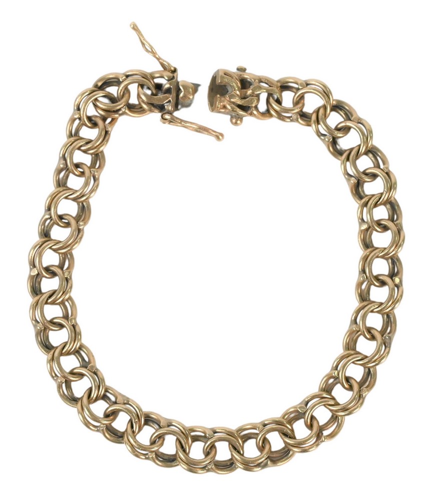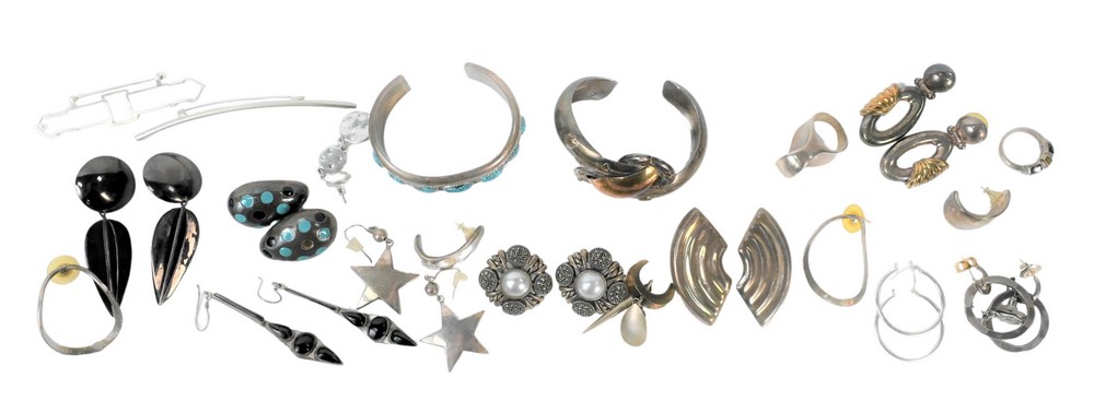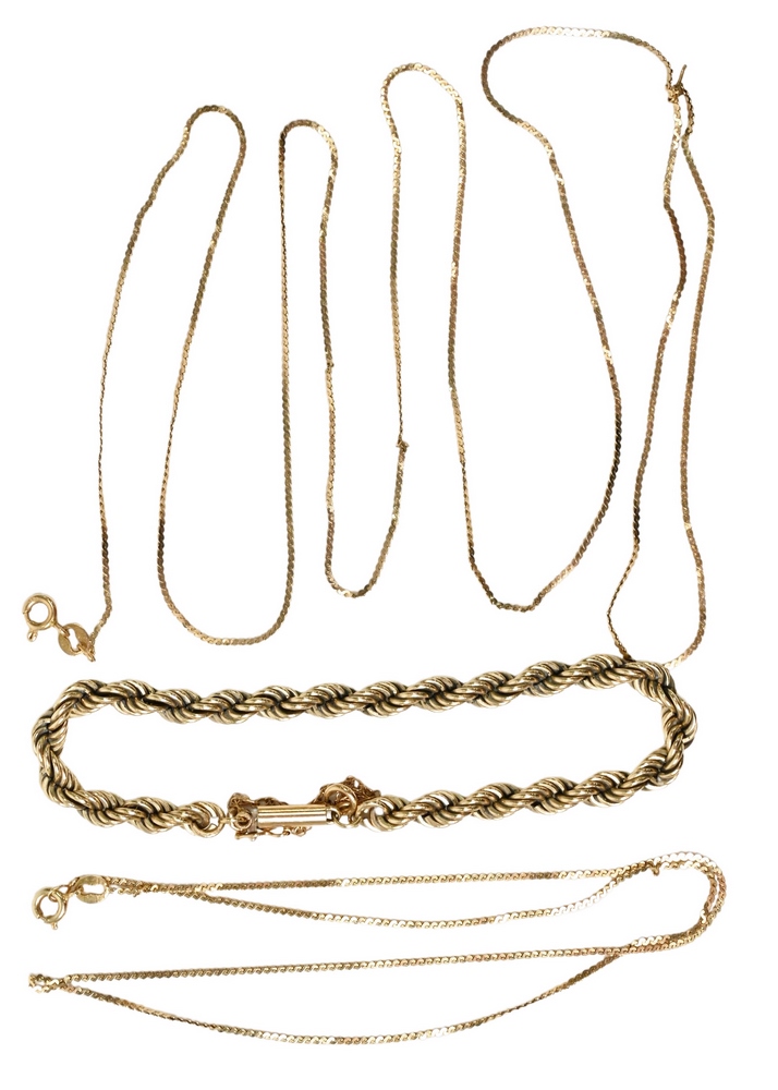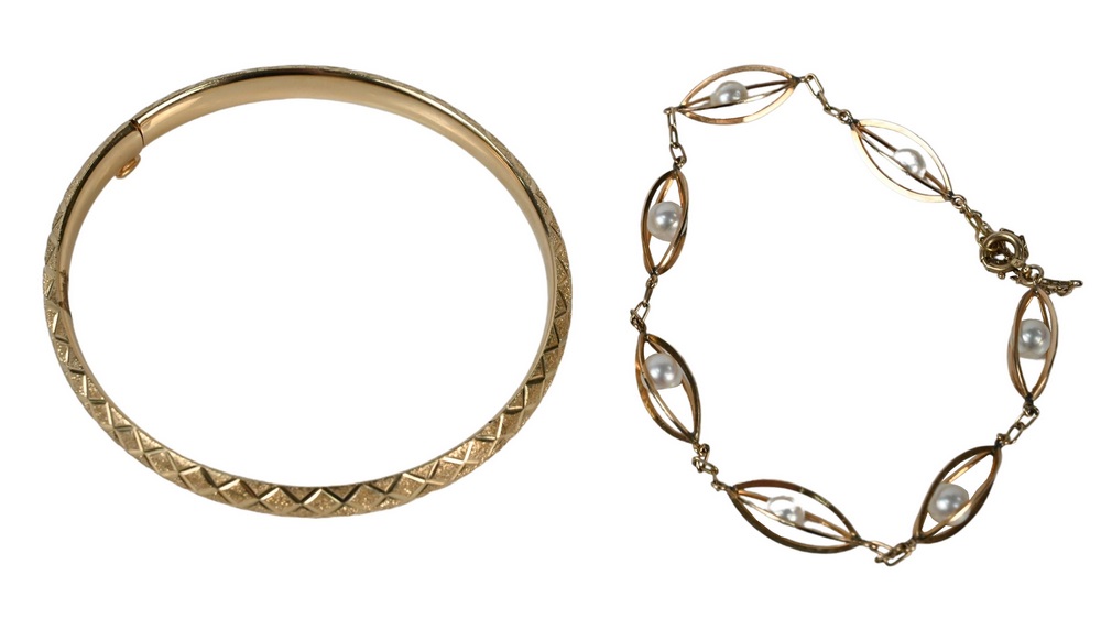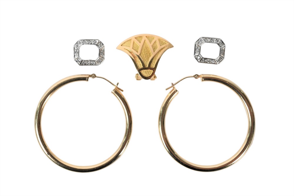 Three Piece Group of Jewelry, to include pair of 14 karat gold and stone earrings, along with a 14 karat gold filled bracelet having scarab hard stones, length 7 inches.