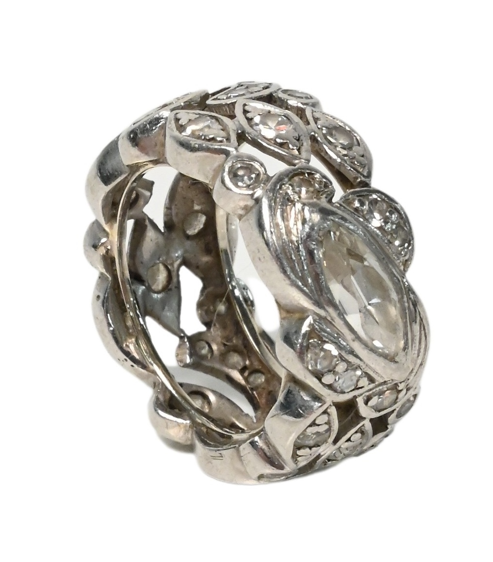 14 Karat Gold Diamond Ring, having two approximately 1/2 carat diamonds in the center with two small diamonds on each side, adjustable from size four to size seven, total weight 7.9 grams.