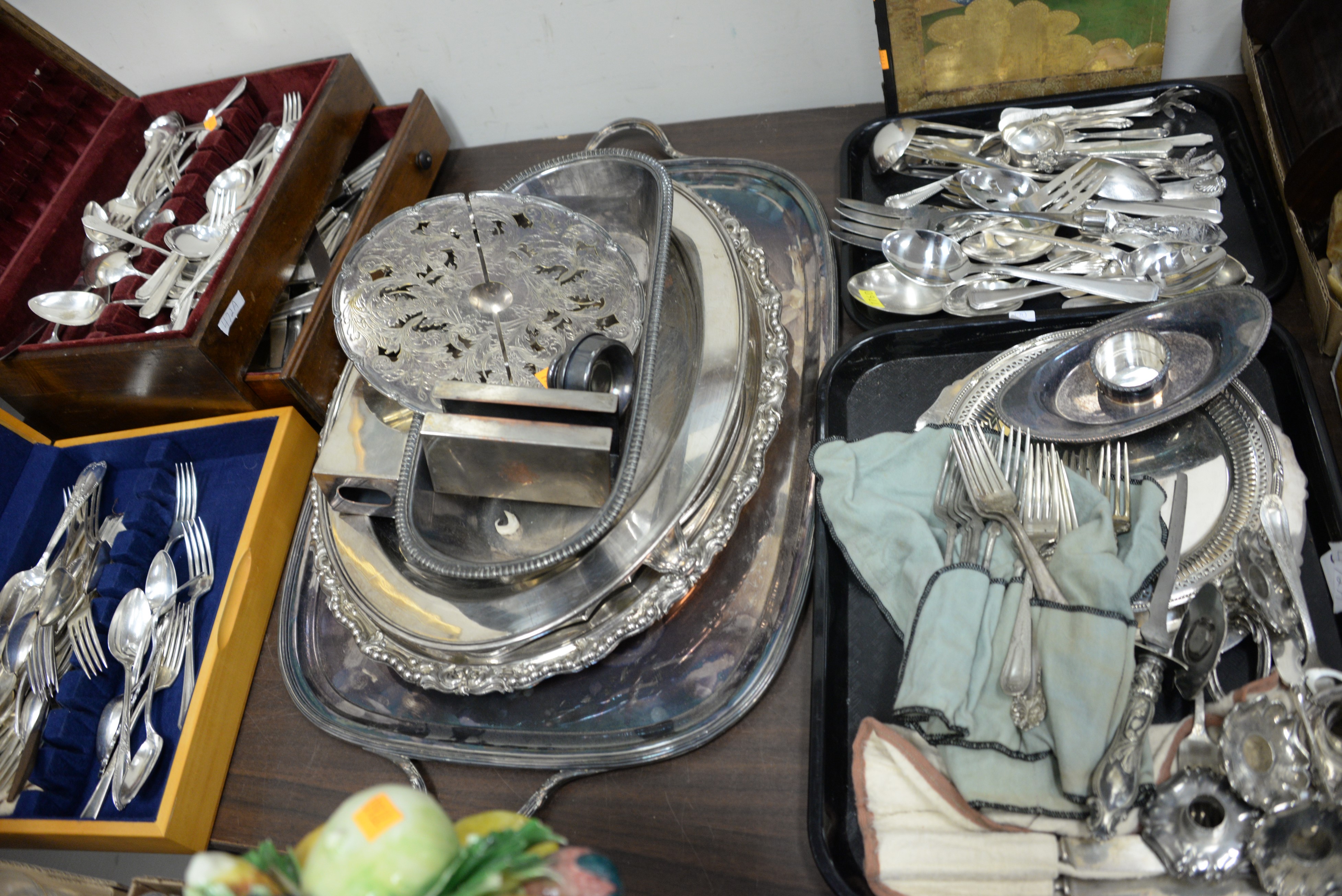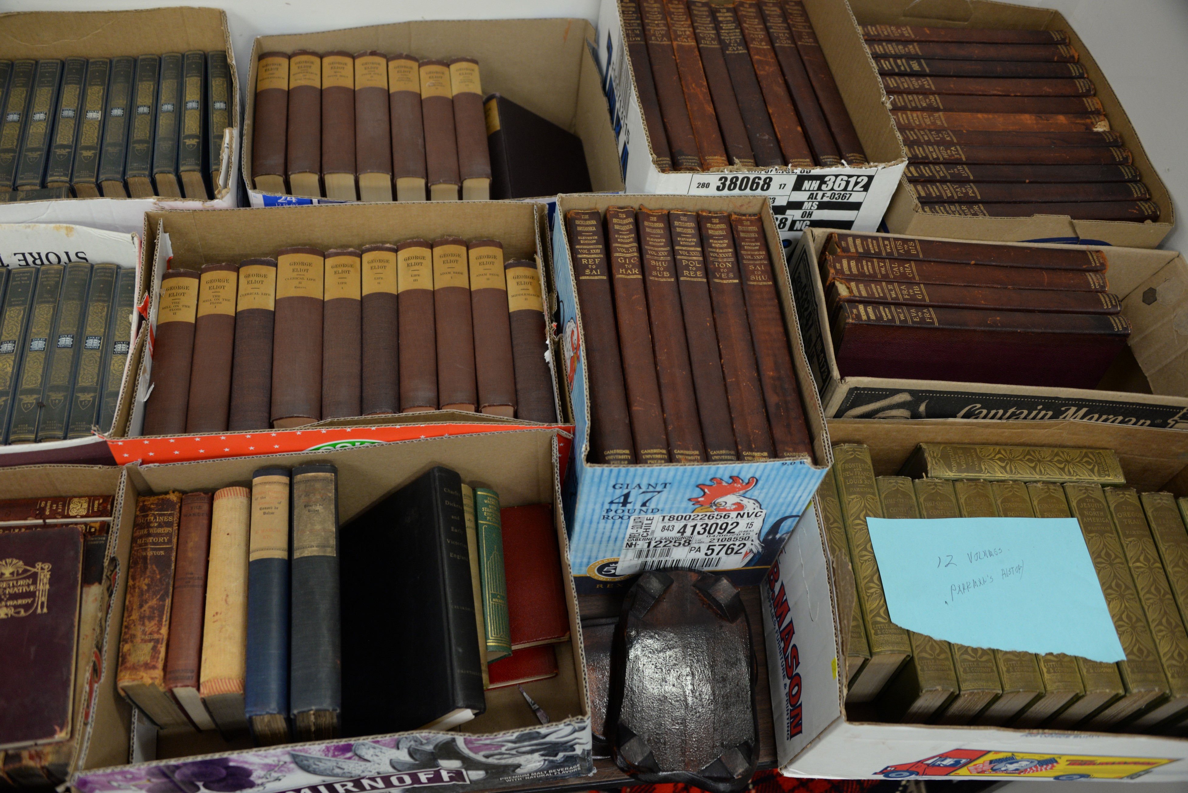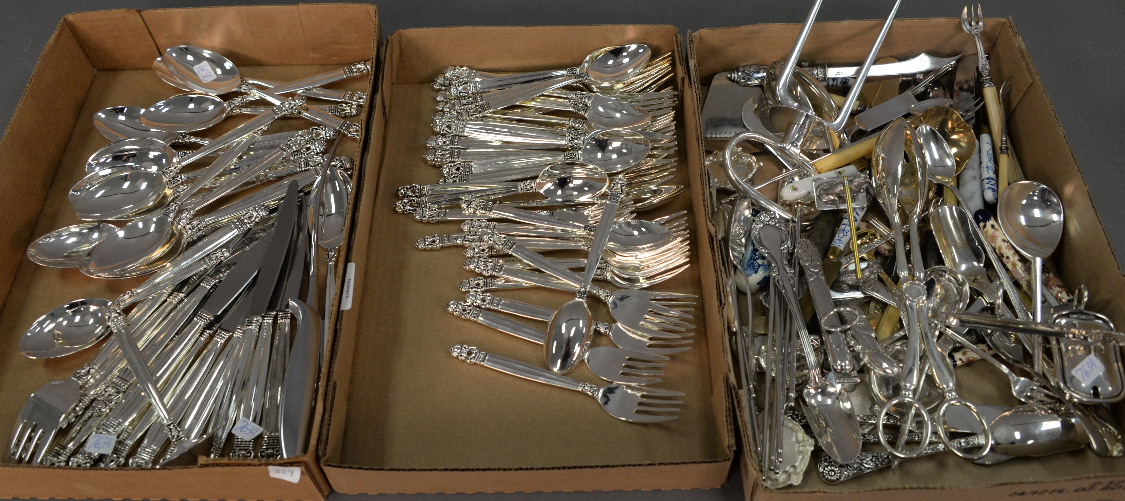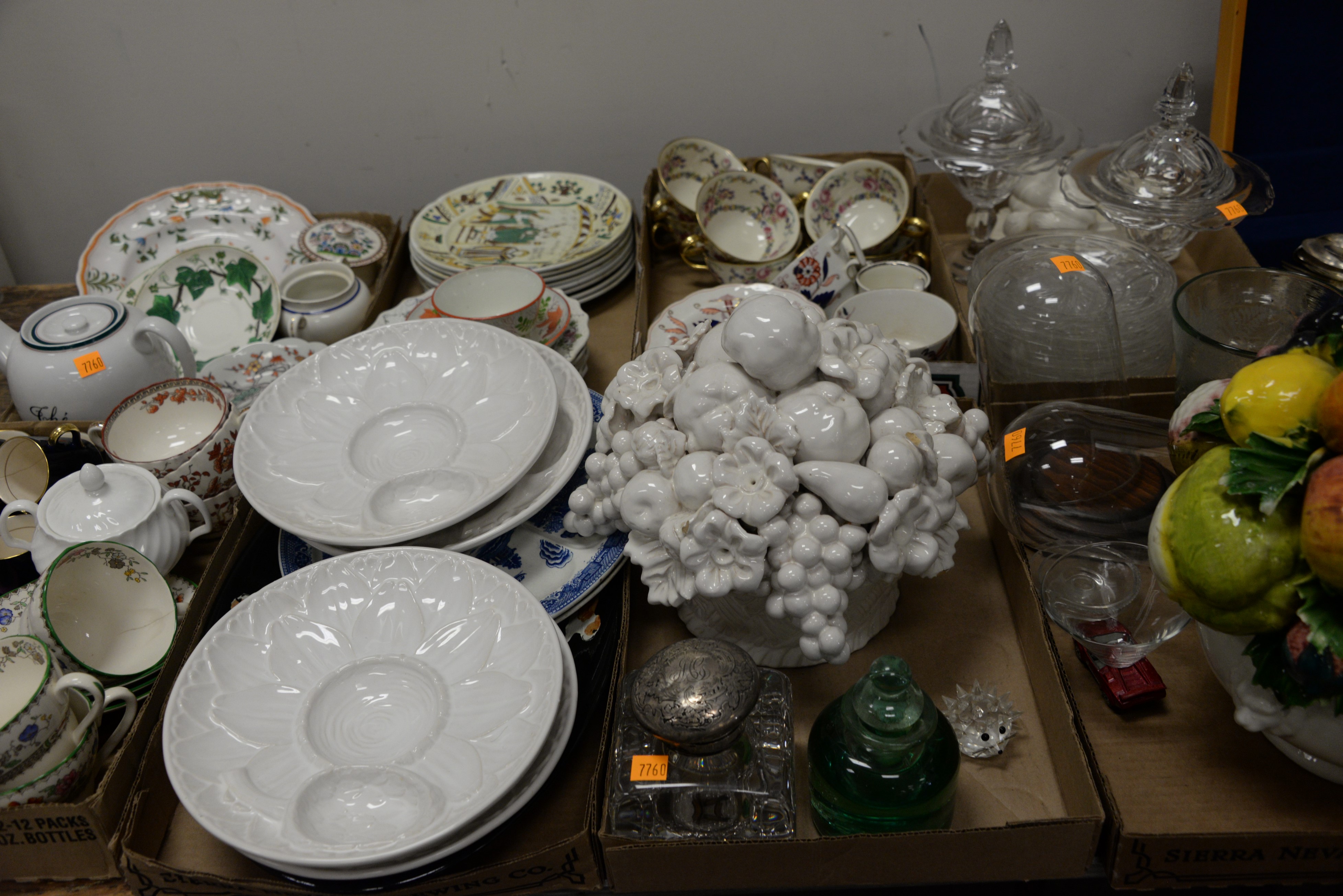 Eight box lots to include two ceramic fruit baskets, Majolica plates, sets of plates, cups and saucers, glass plates, compotes, large crystal inkwell with sterling top, etc.