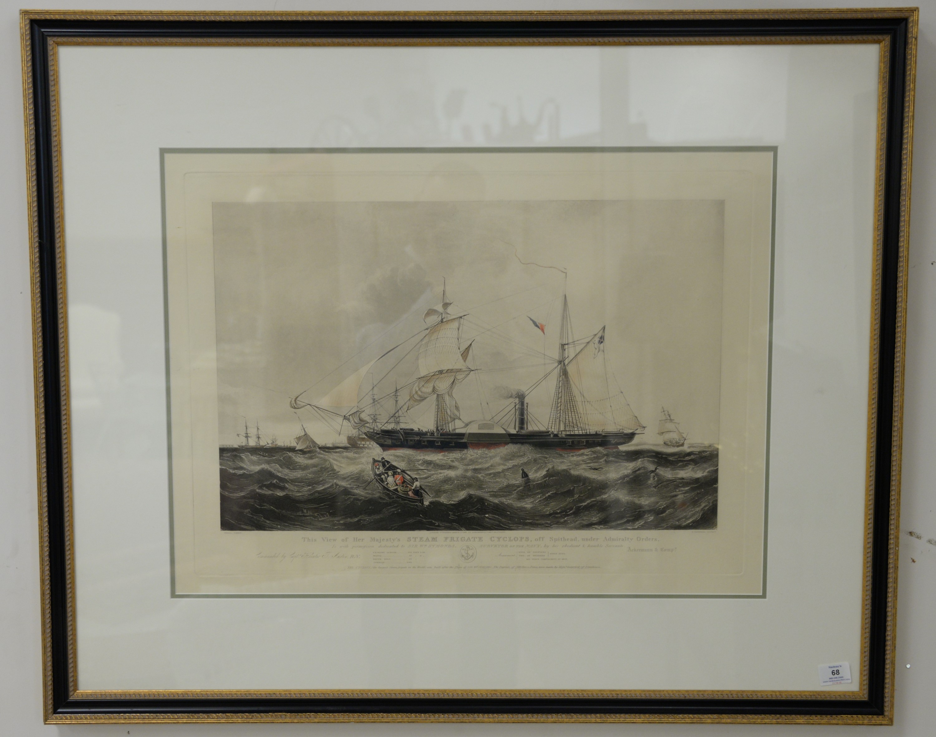 After William Adolphus Knell 1802-1875, hand colored engraving, View of Her Majesty’s Steam Frigate Cyclops, off spithead, under Admiralty orders, engraved by Papprill. 19 1/4 x 26 1/2 plate size Property from Credit Suisse’s Americana Collection