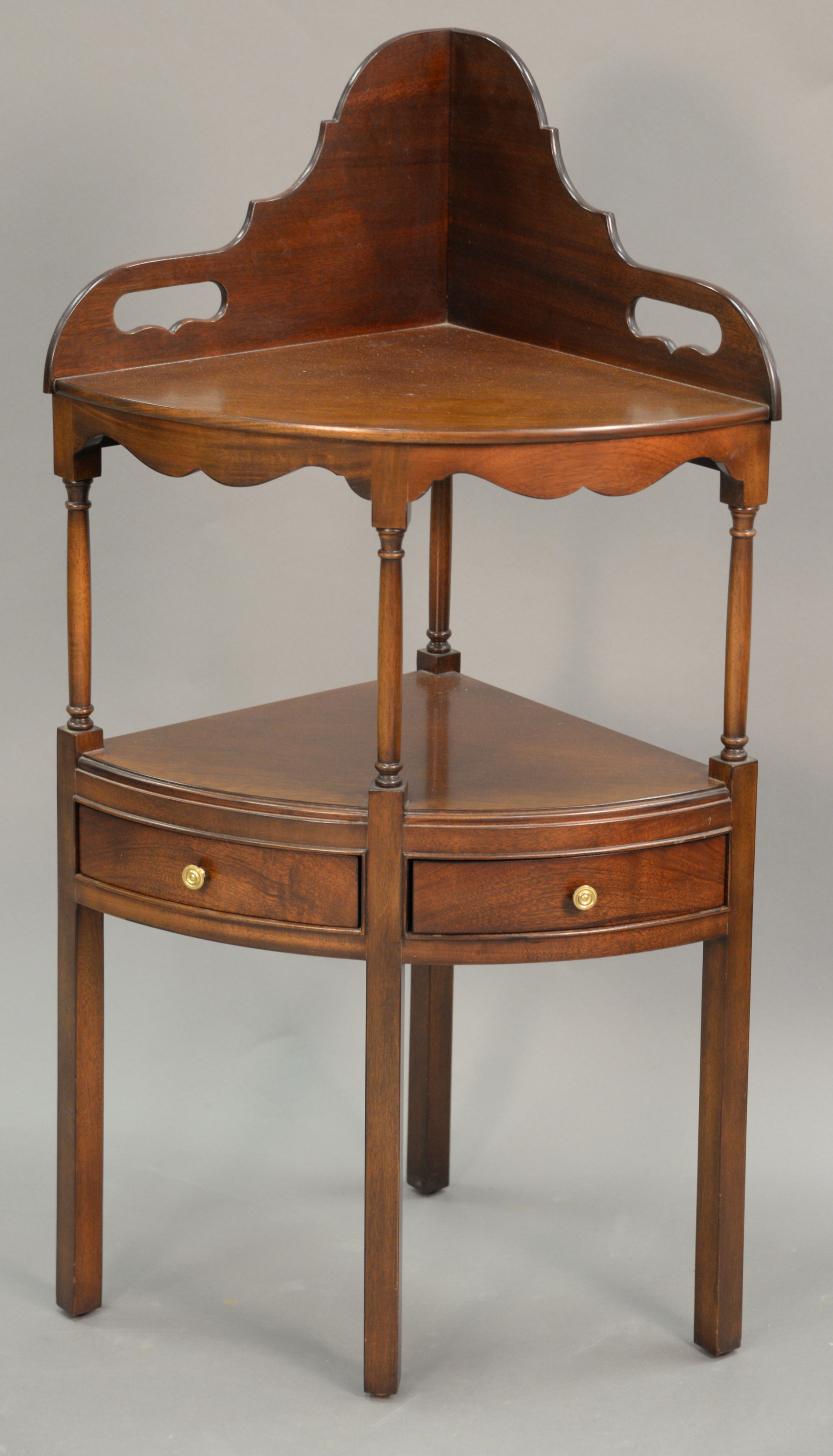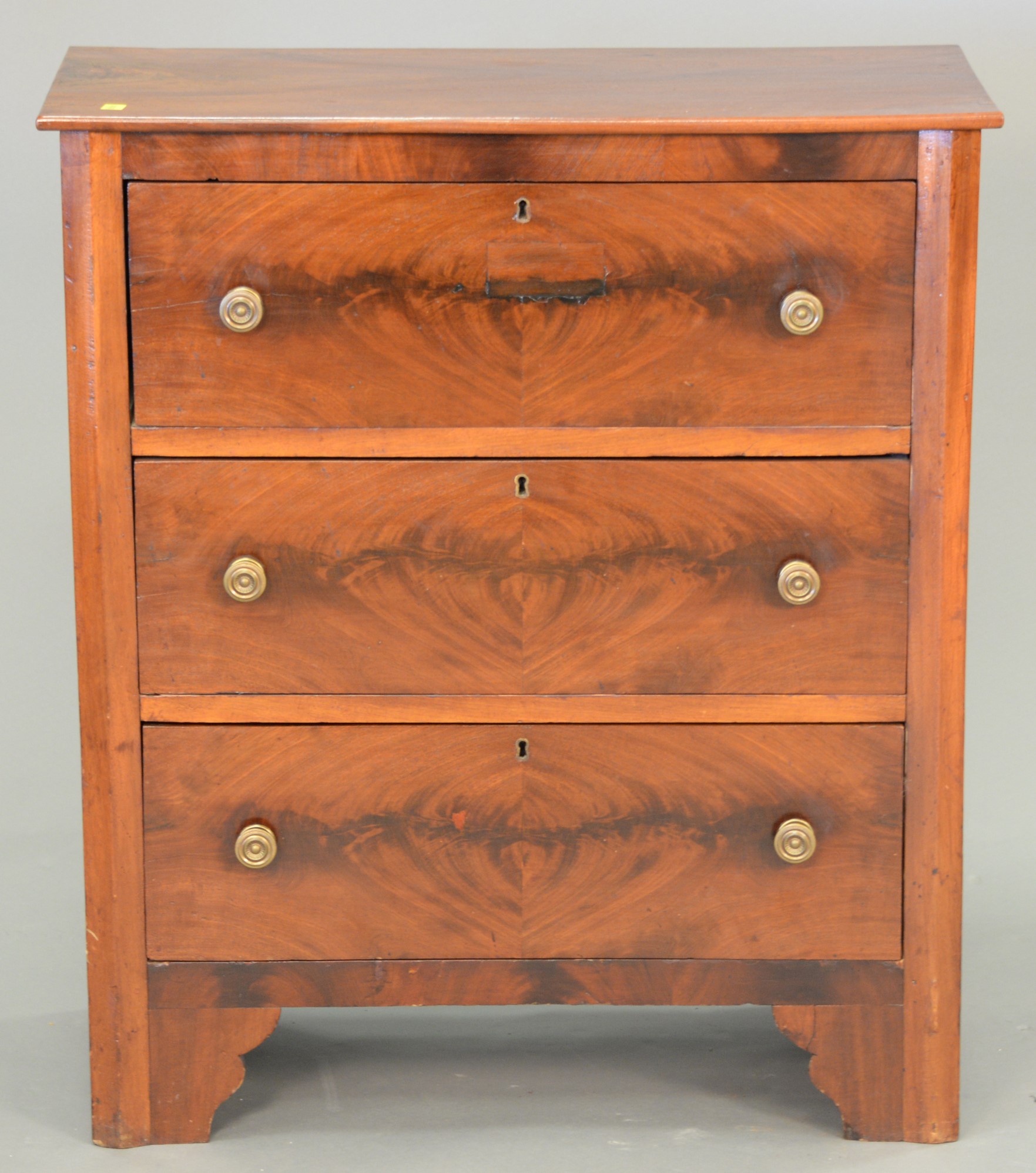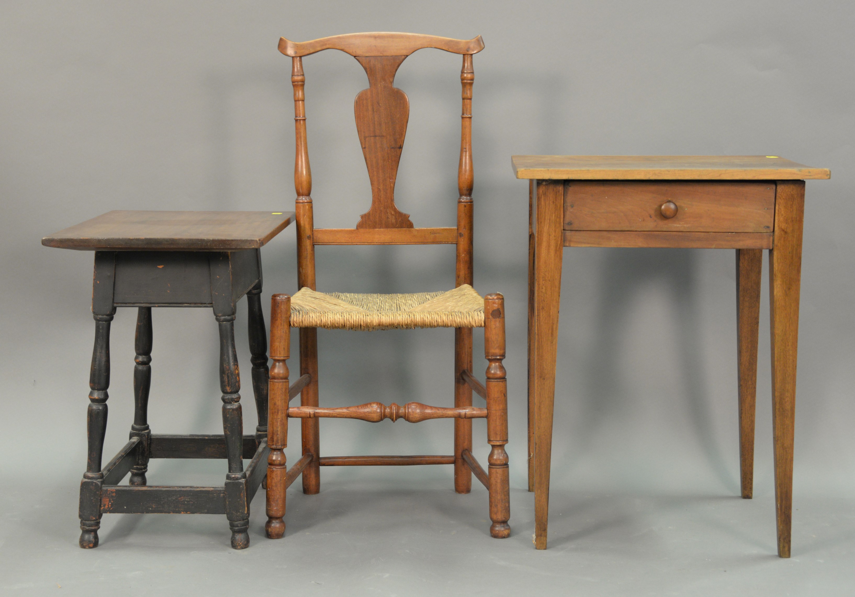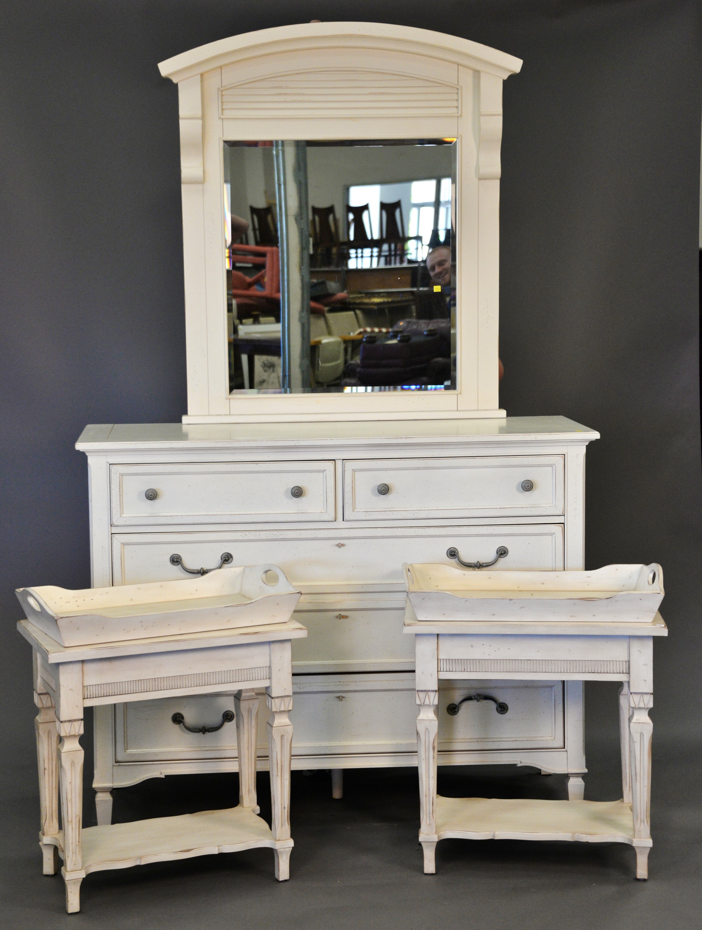Three piece lot including Contemporary chest and mirror and a pair of Contemporary tables with removable tray tops. dresser: ht. 43 in. wd. 56 in. dp. 20 in., end tables: ht. 31 in. wd. 26 in. dp. 16 in.