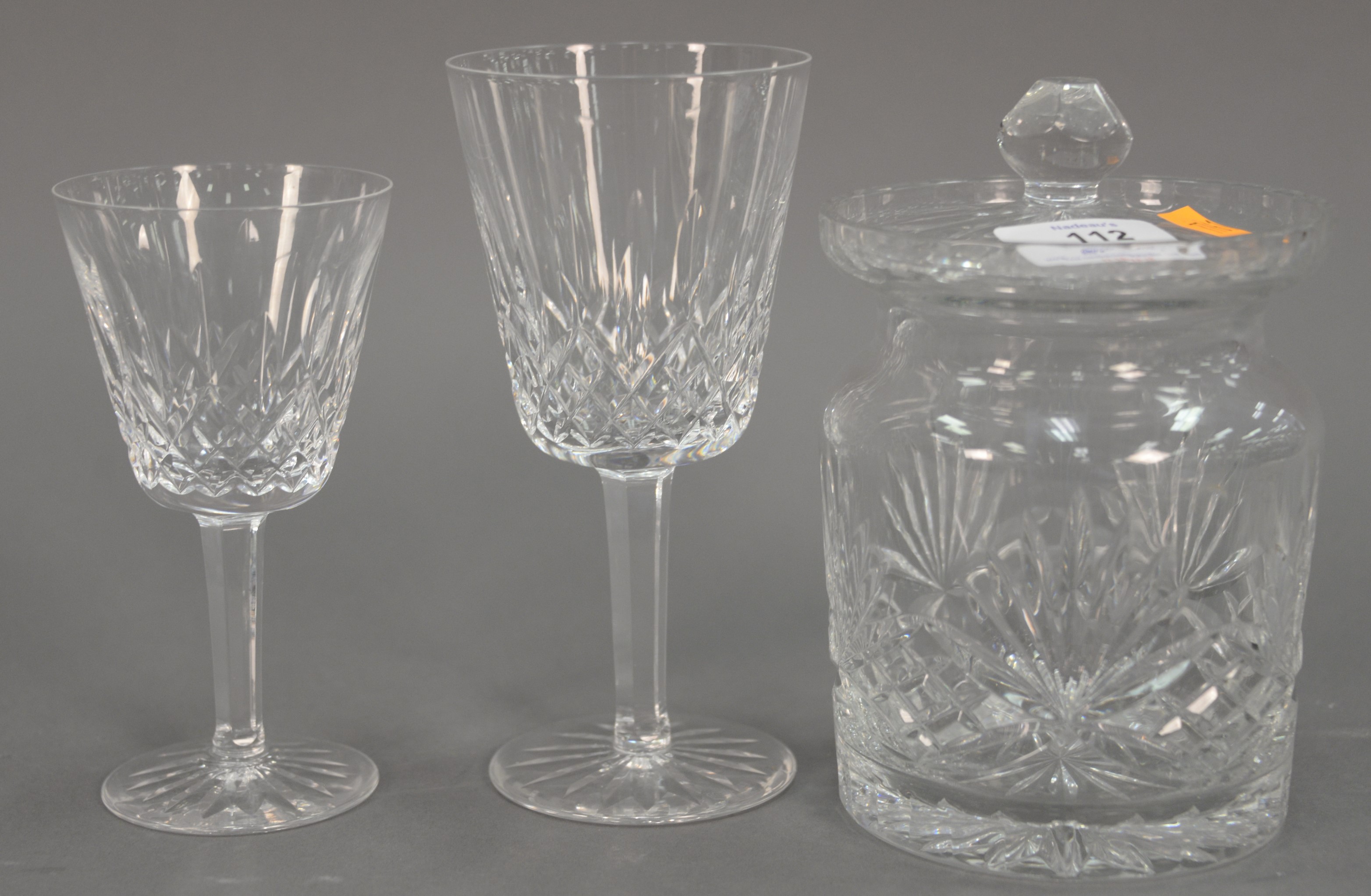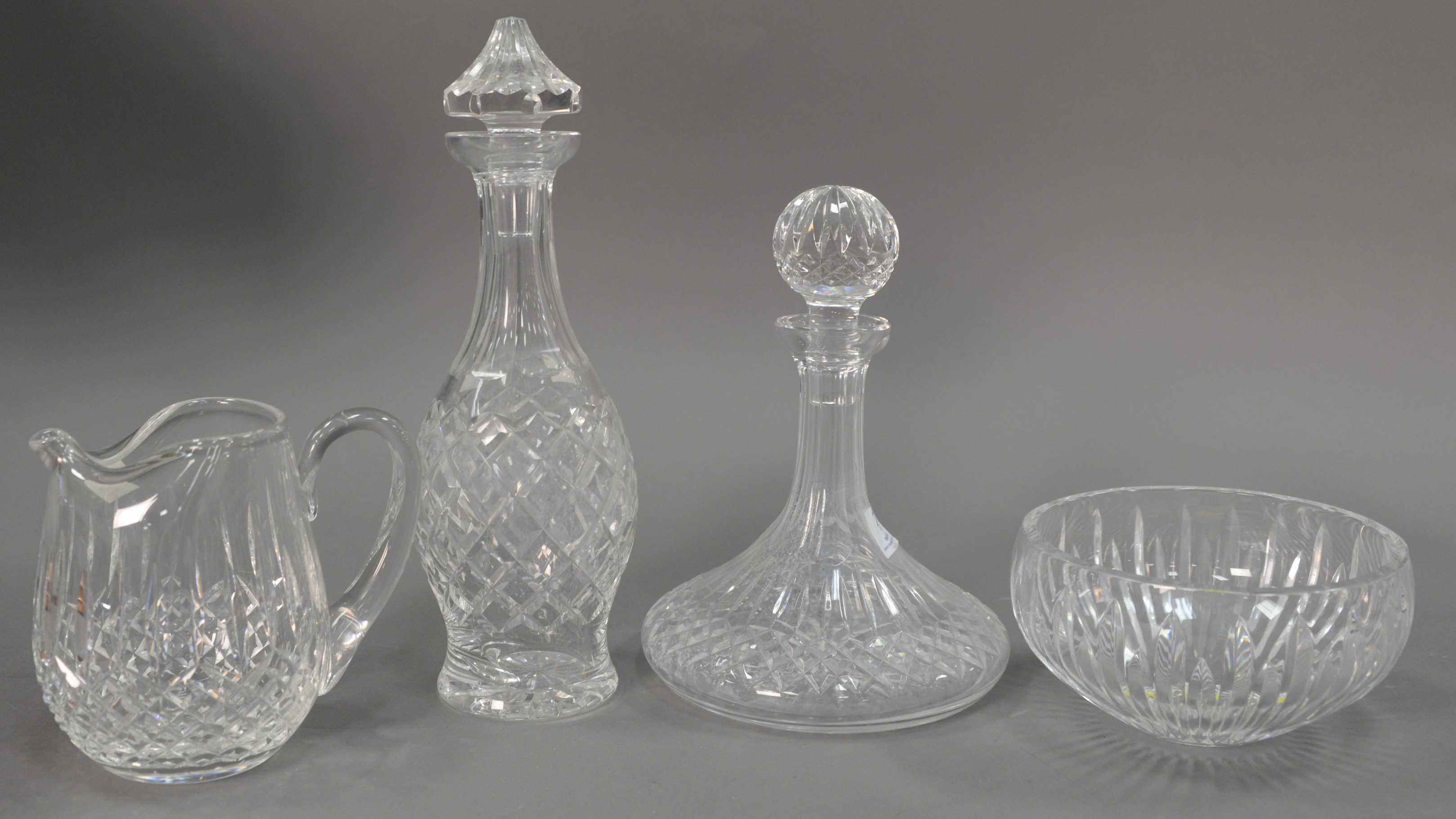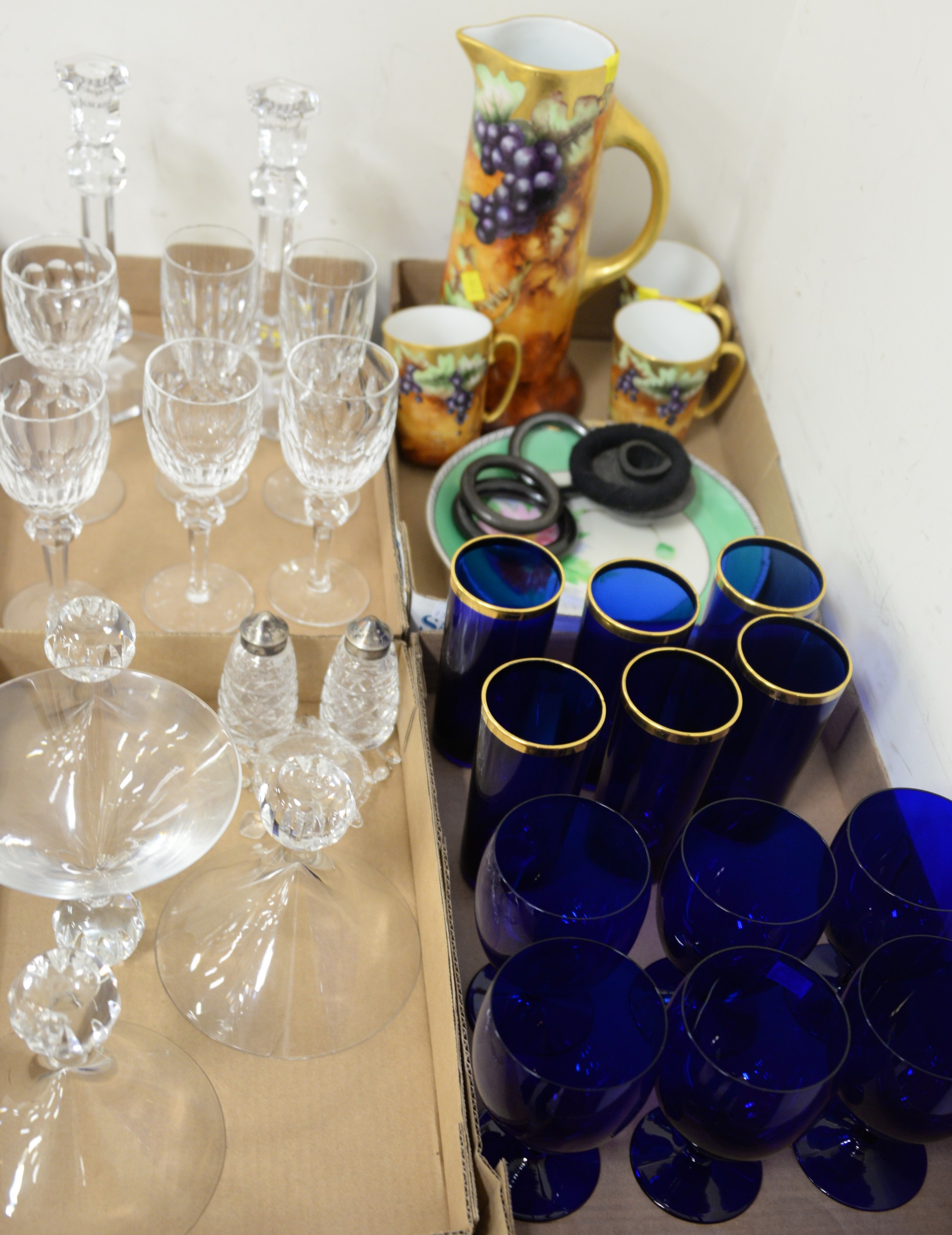 Four box lots to include six Waterford stems, salt and pepper shaker, set of four St. Louis Stems, Three piece painted pitcher & two cups, and two sets of blue glasses.