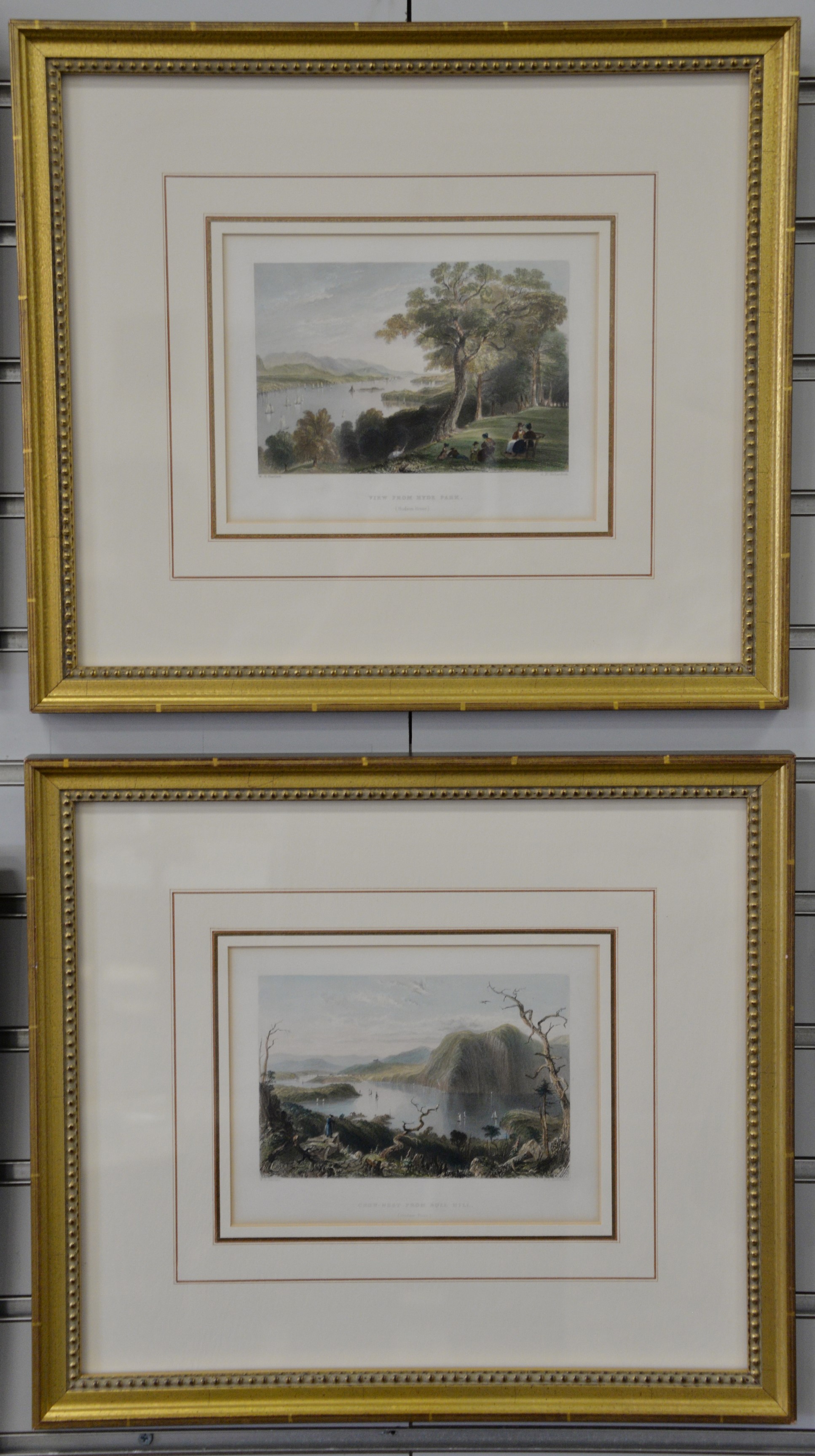 Set of eight William H. Bartlett Boston and Hudson River hand colored steel engravings, all framed and matted by Wesley Allen Framemakers including Boston and Bunker Hill, State Street Boston, Faneuil Hall Boston, View from Port Putnam, Crow-Nest from Bull Hill, View from Hyde Park, View from West Point, and Lighthouse Near Caldwell’s Landing, 6 x 8 1/4 sight size. Property from Credit Suisse’s Americana Collection