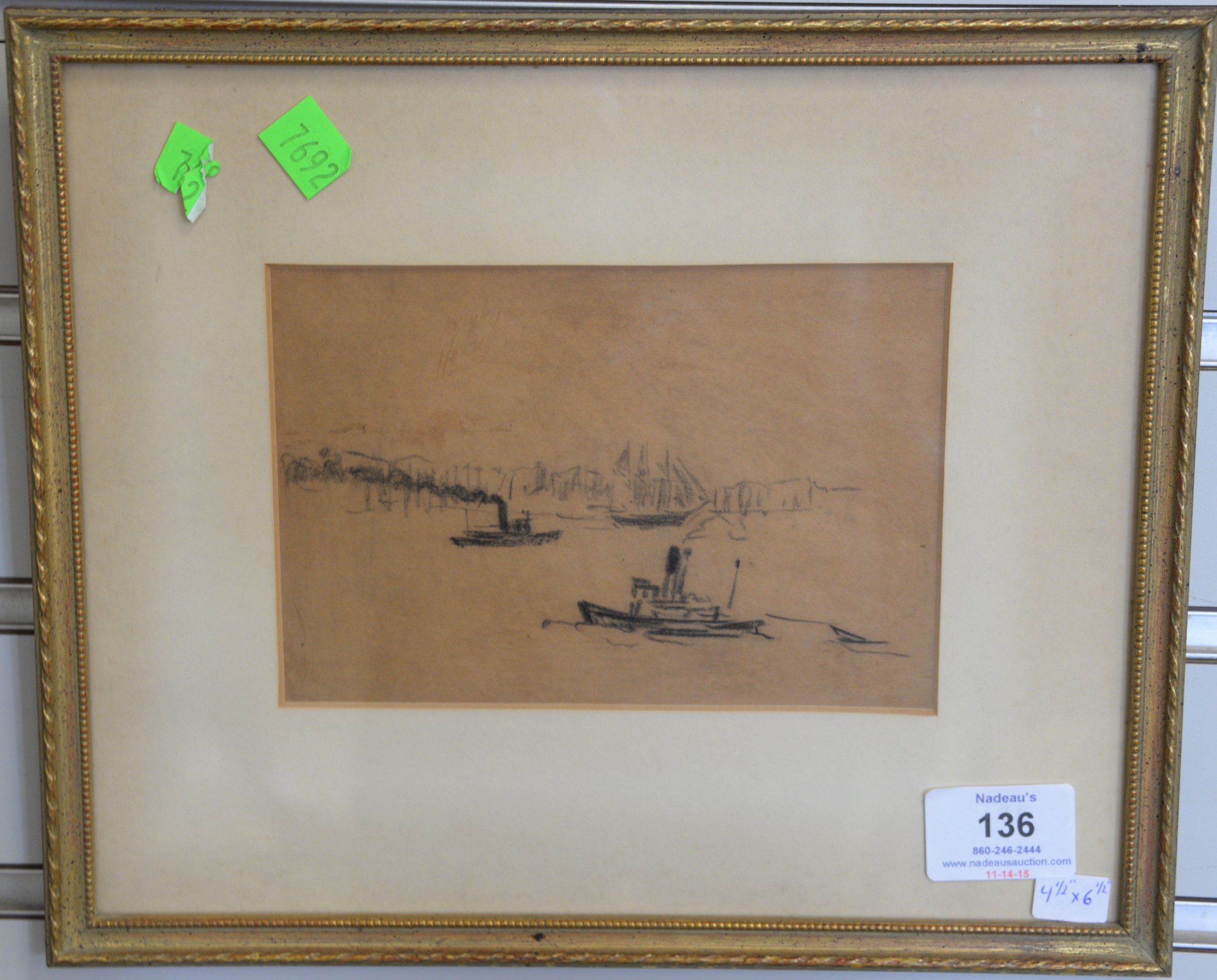 William James Glackens 1870-1938 sketch, Tug-Boats, New York Harbor, written on back: Tug-Boats, New York Harbor. Sketch by Wm. Glackens for Stanley W. Dimmock From his cousin Ann Dimmock Glackens Aug. 1970., 4 1/2 x 6 1/2.