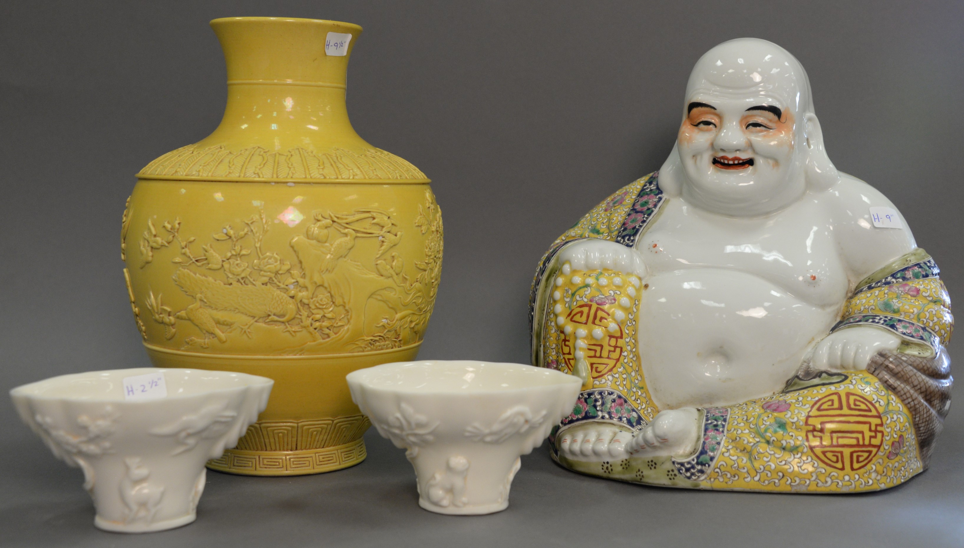 Four Chinese Oriental porcelain pieces to include a Buddha, pair of cups, and a yellow glazed molded vase with seal mark on bottom. Buddha ht. 9 in. vase: 9 1/2 in.