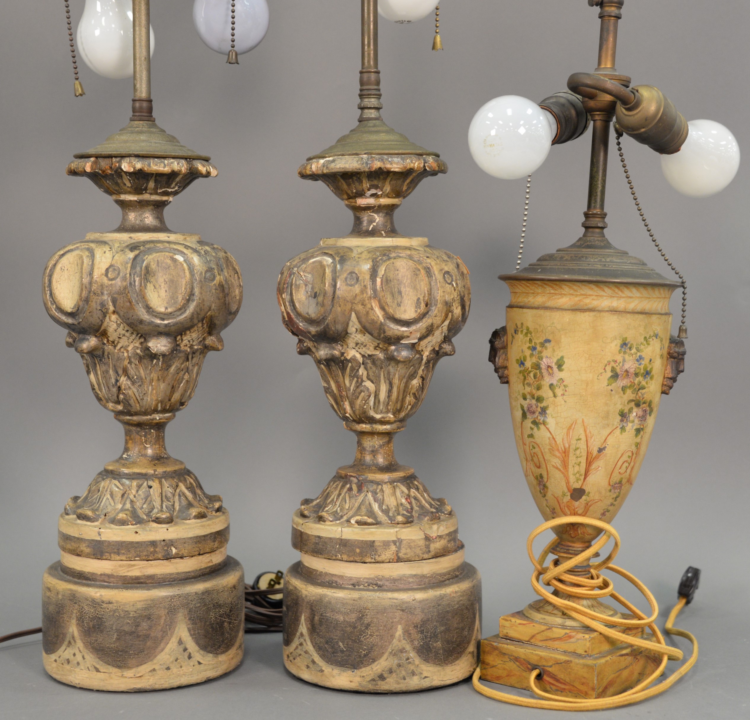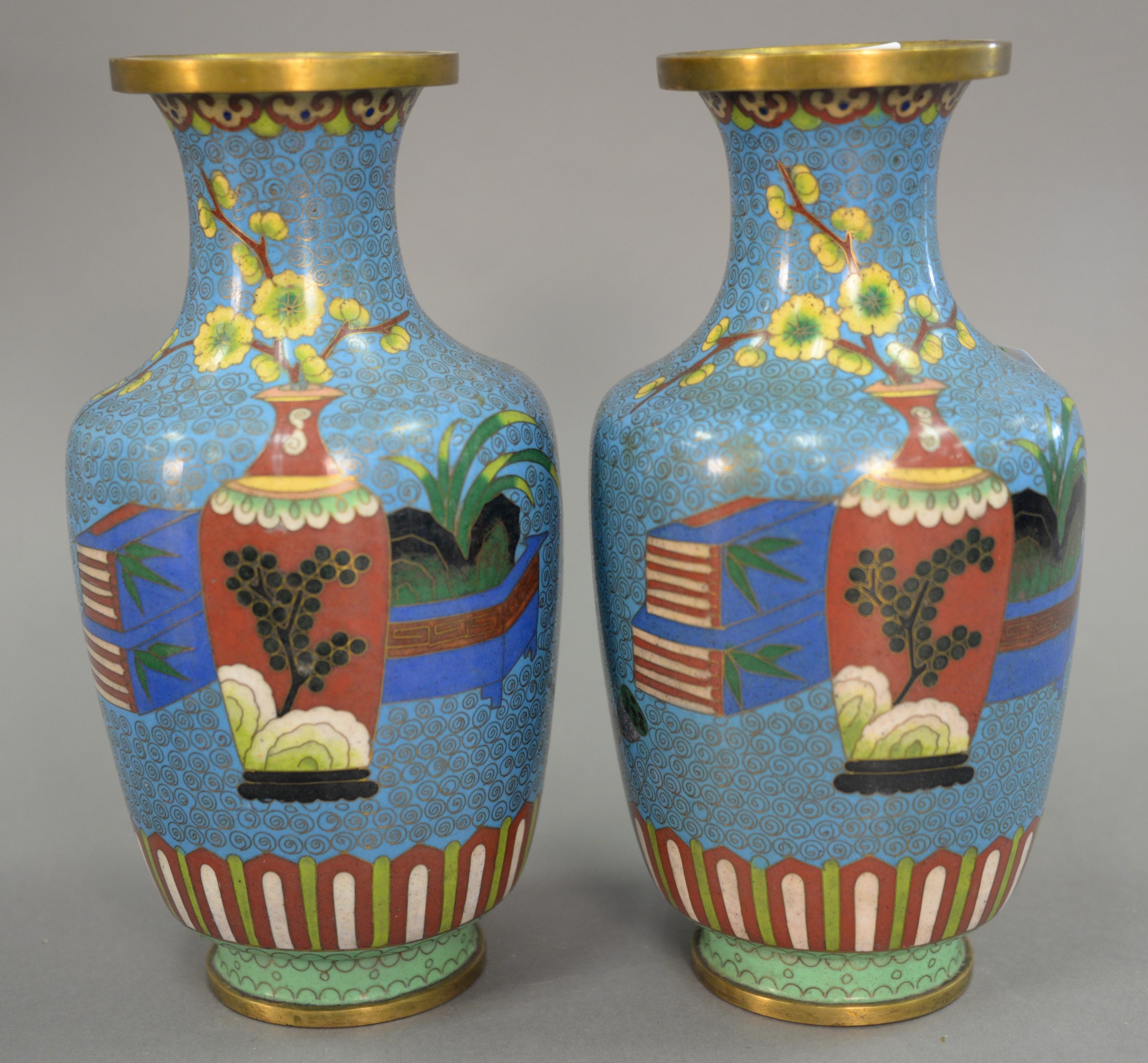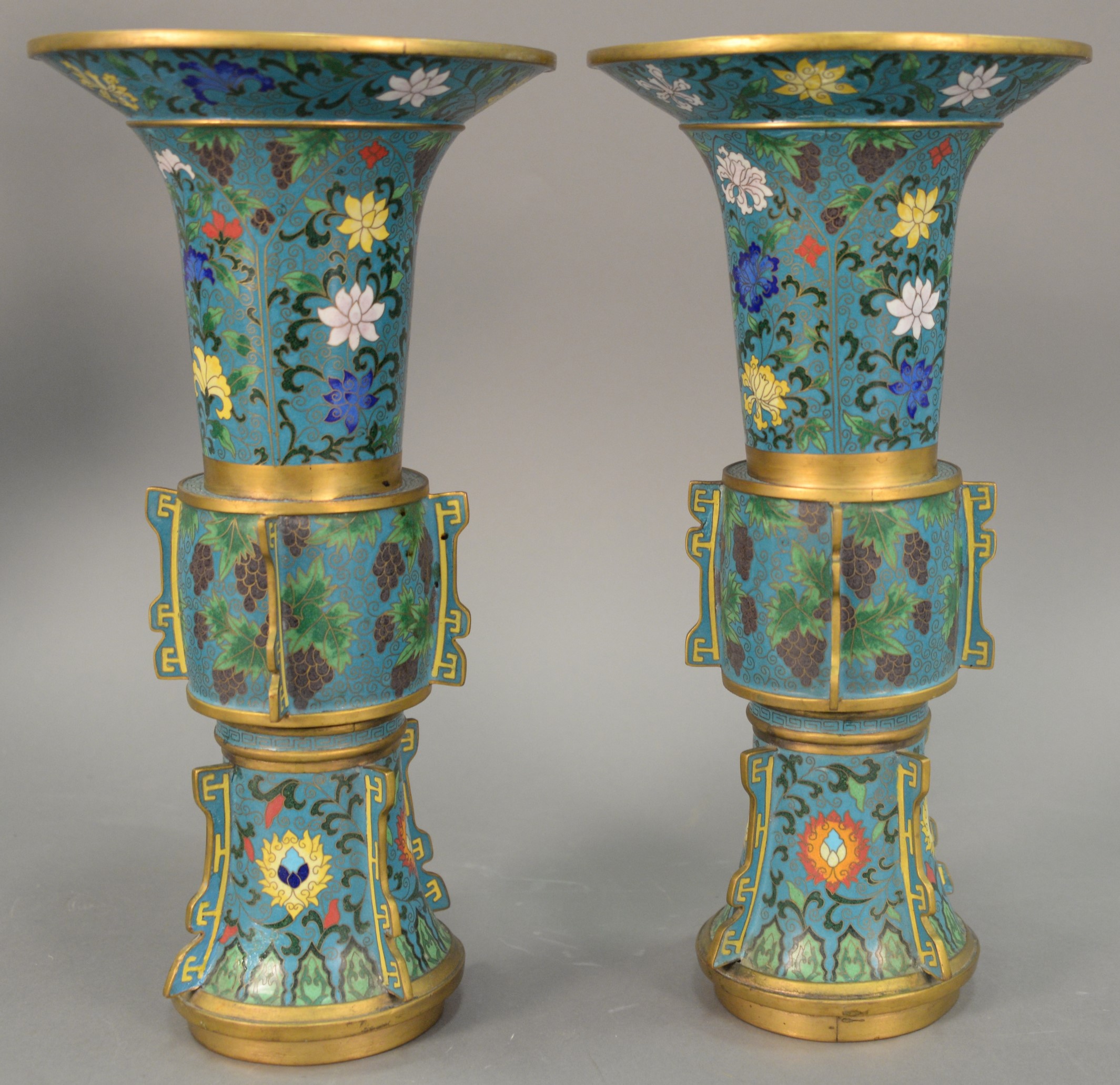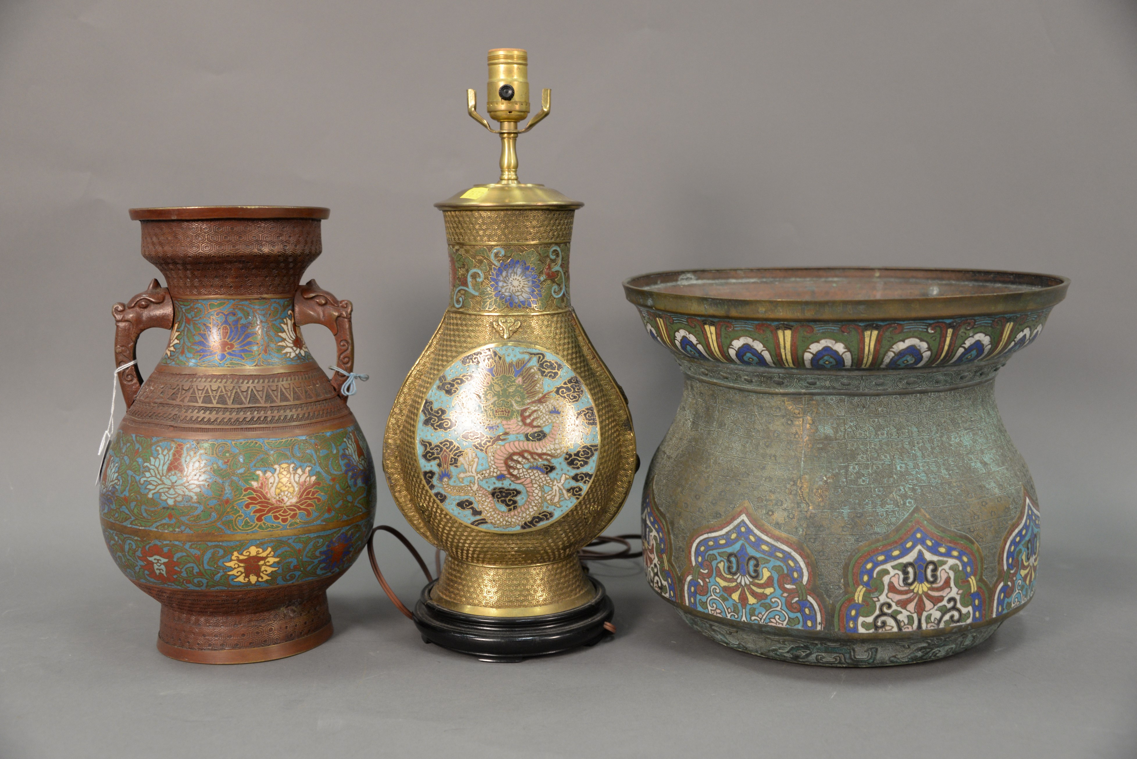 Three champleve pieces including a bronze urn with lotus flowers, large planter, and a vase made into a table lamp with four claw dragon panels. ht. 11 3/4 in. dia. 14 in.