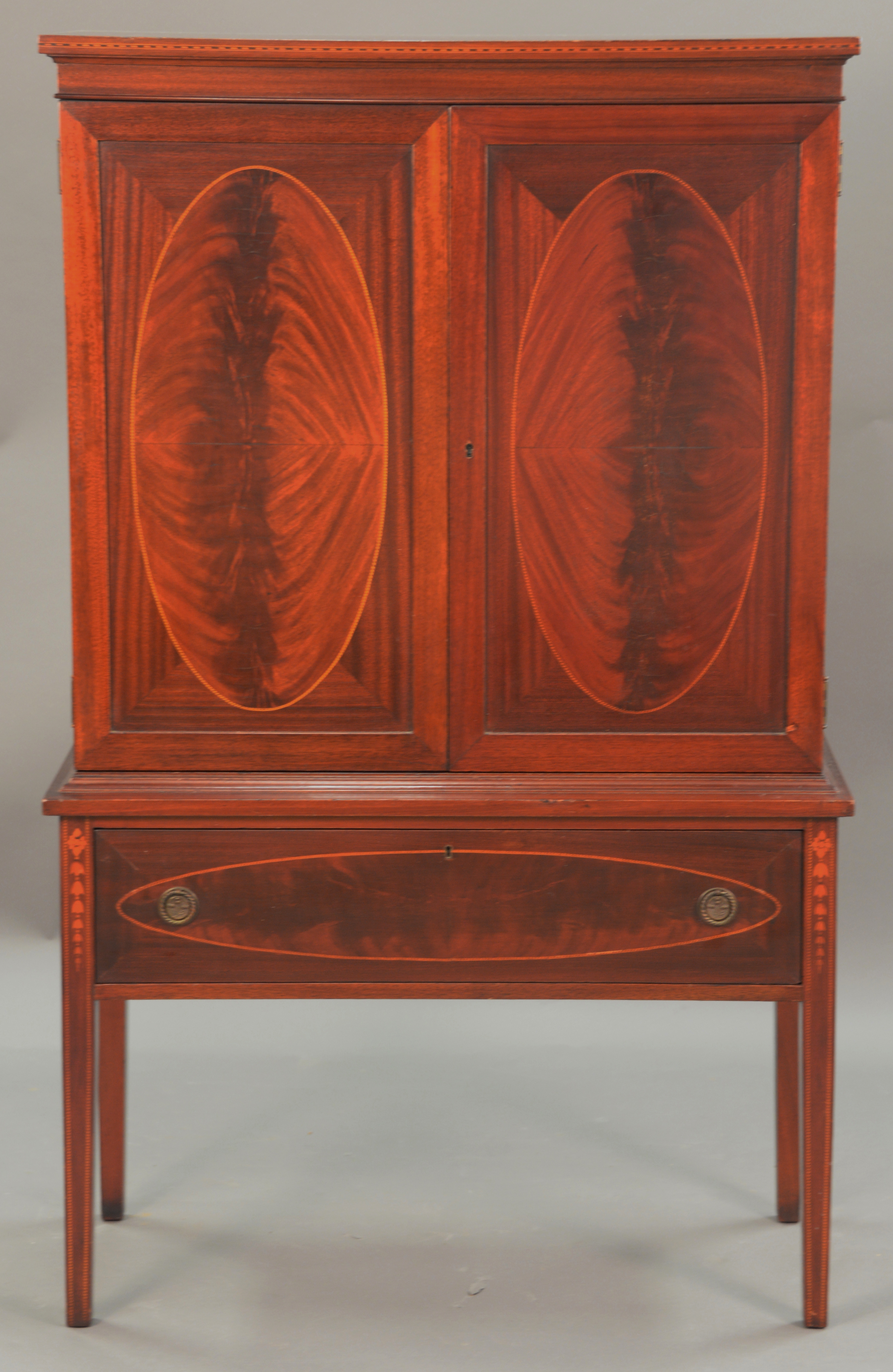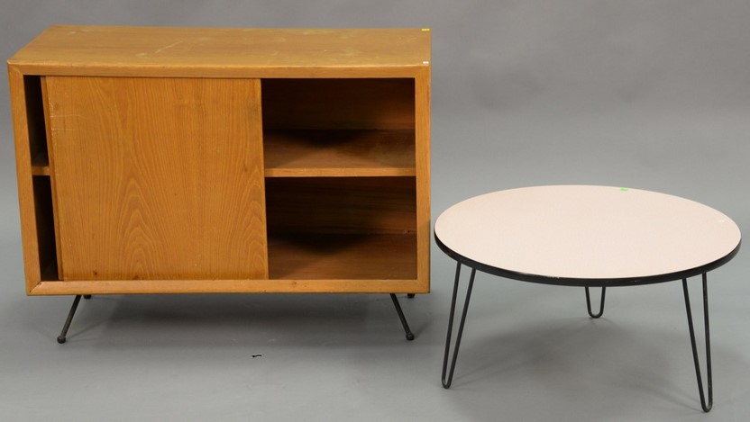 Two piece lot to include Swedish blond sliding door cabinet and a Space Age round/hairpin coffee table Homegrown Aldon’s Woodworking, New Britain, CT. ht. 14 1/2 in. dia. 28 in.