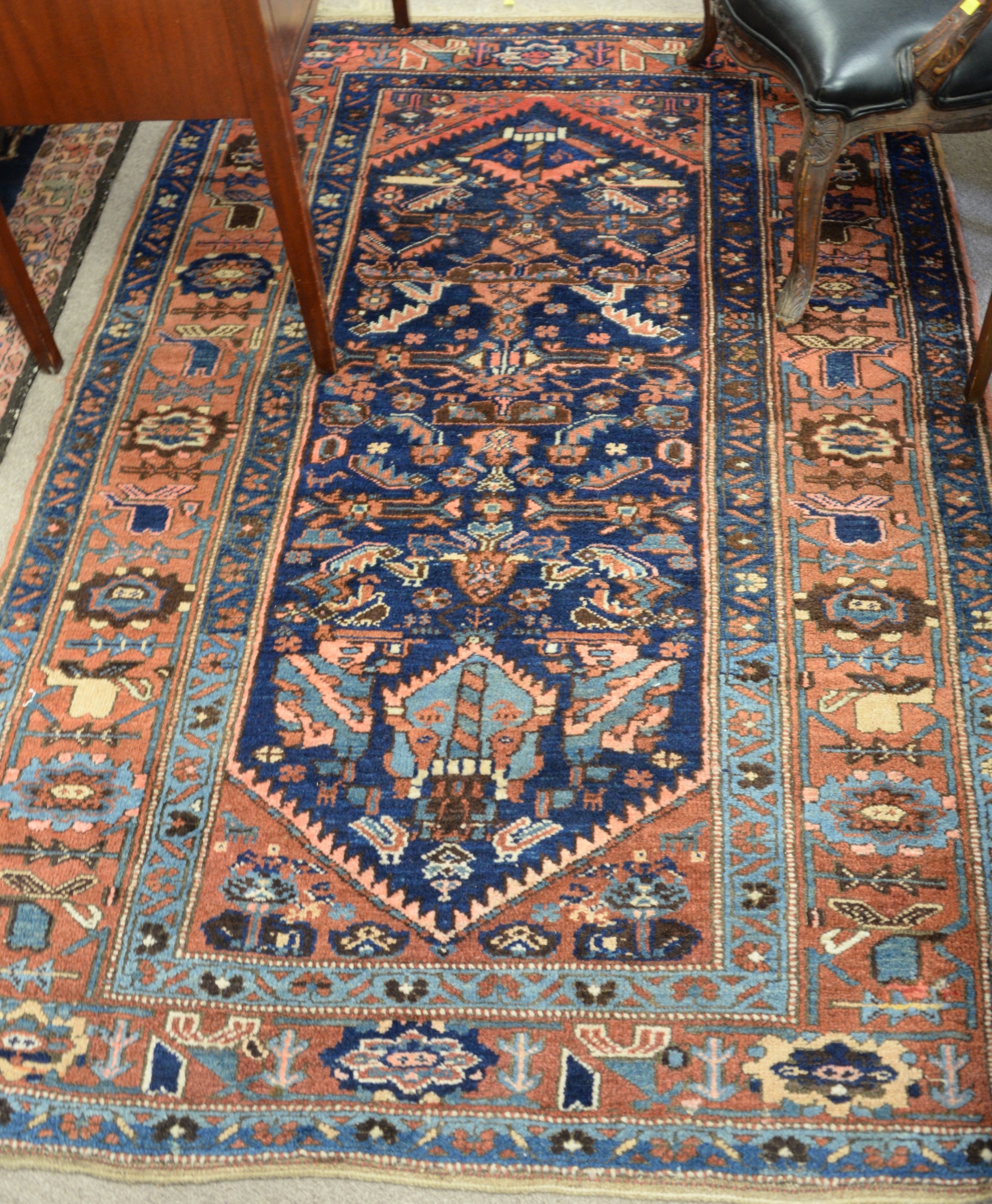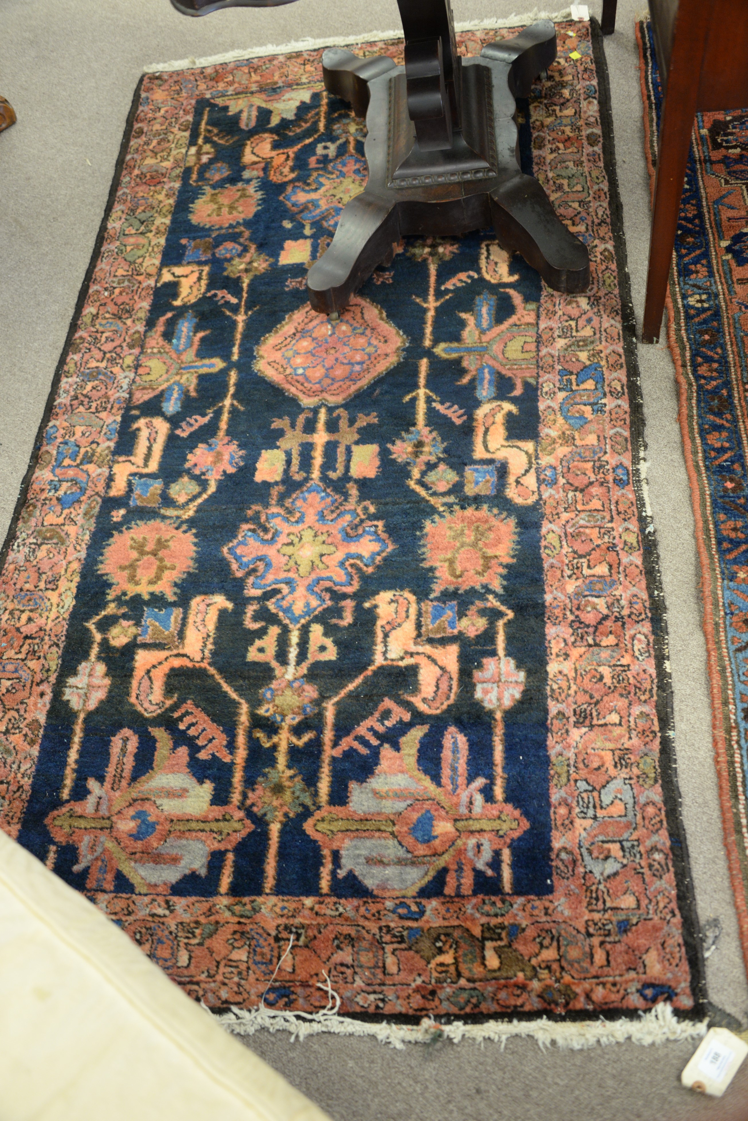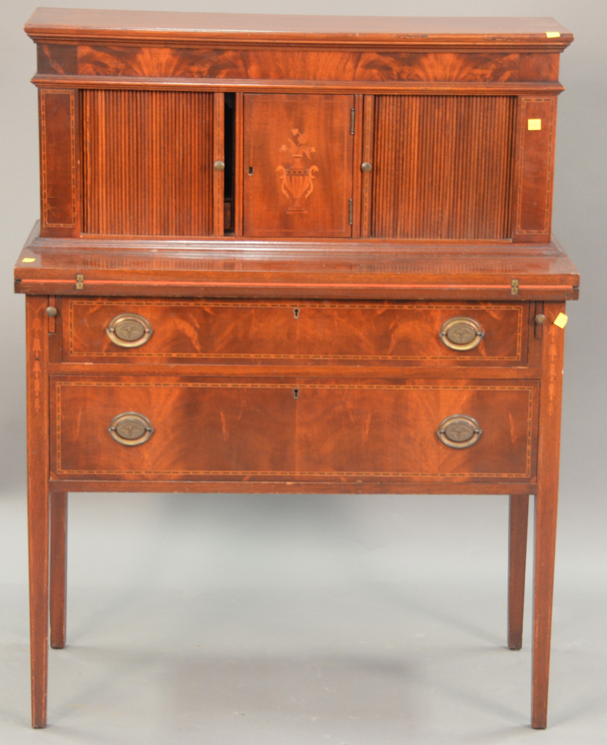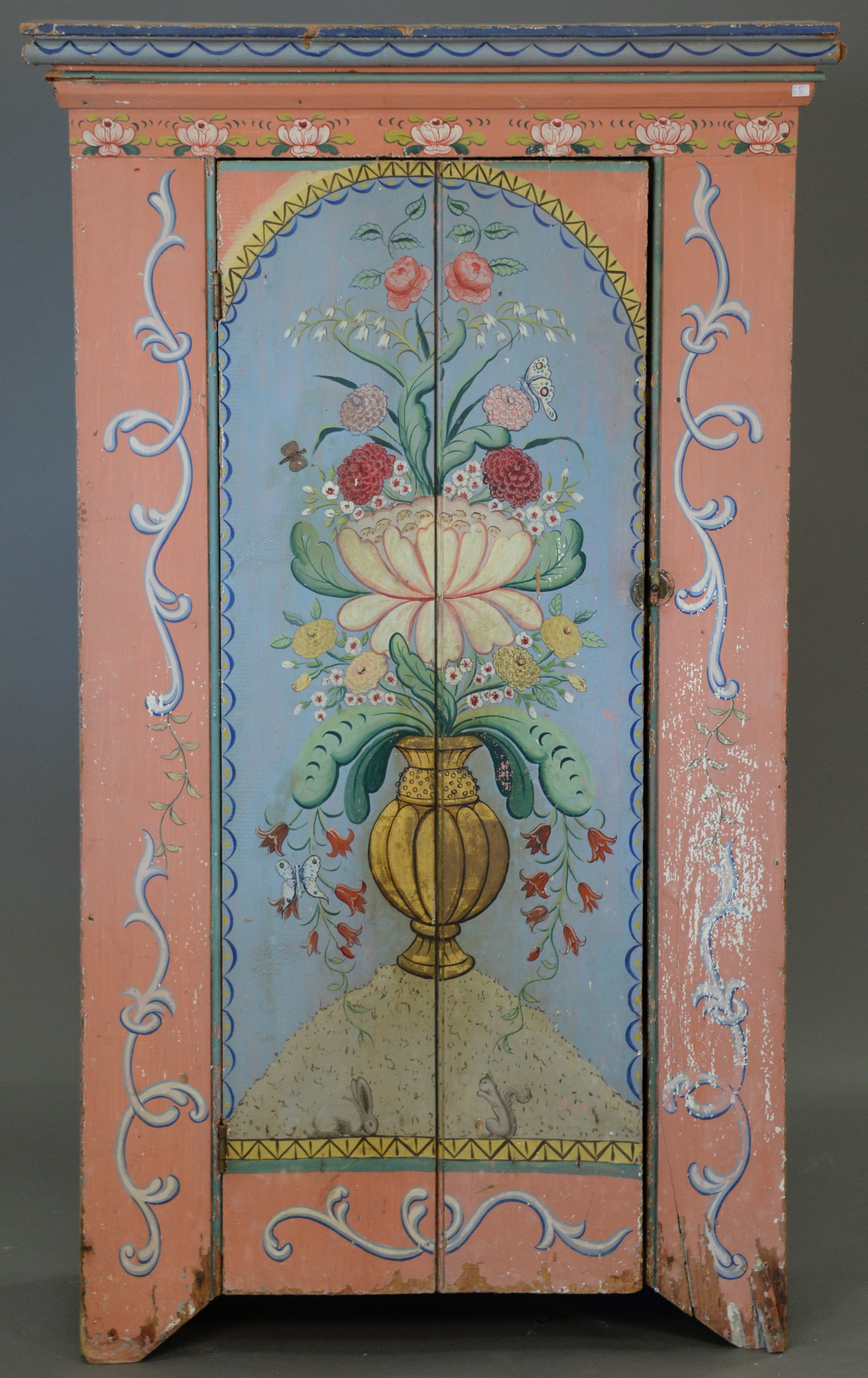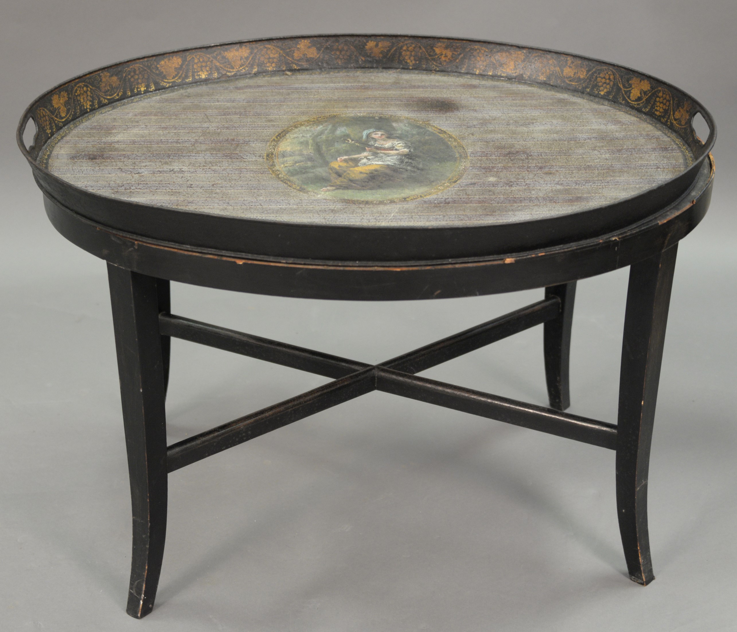 Tole tray with hand painted oval panel of seated woman, having two handles, now on oval stand, tray is early to mid 19th century. ht. 20 in. wd. 30 in. dp. 24 in.