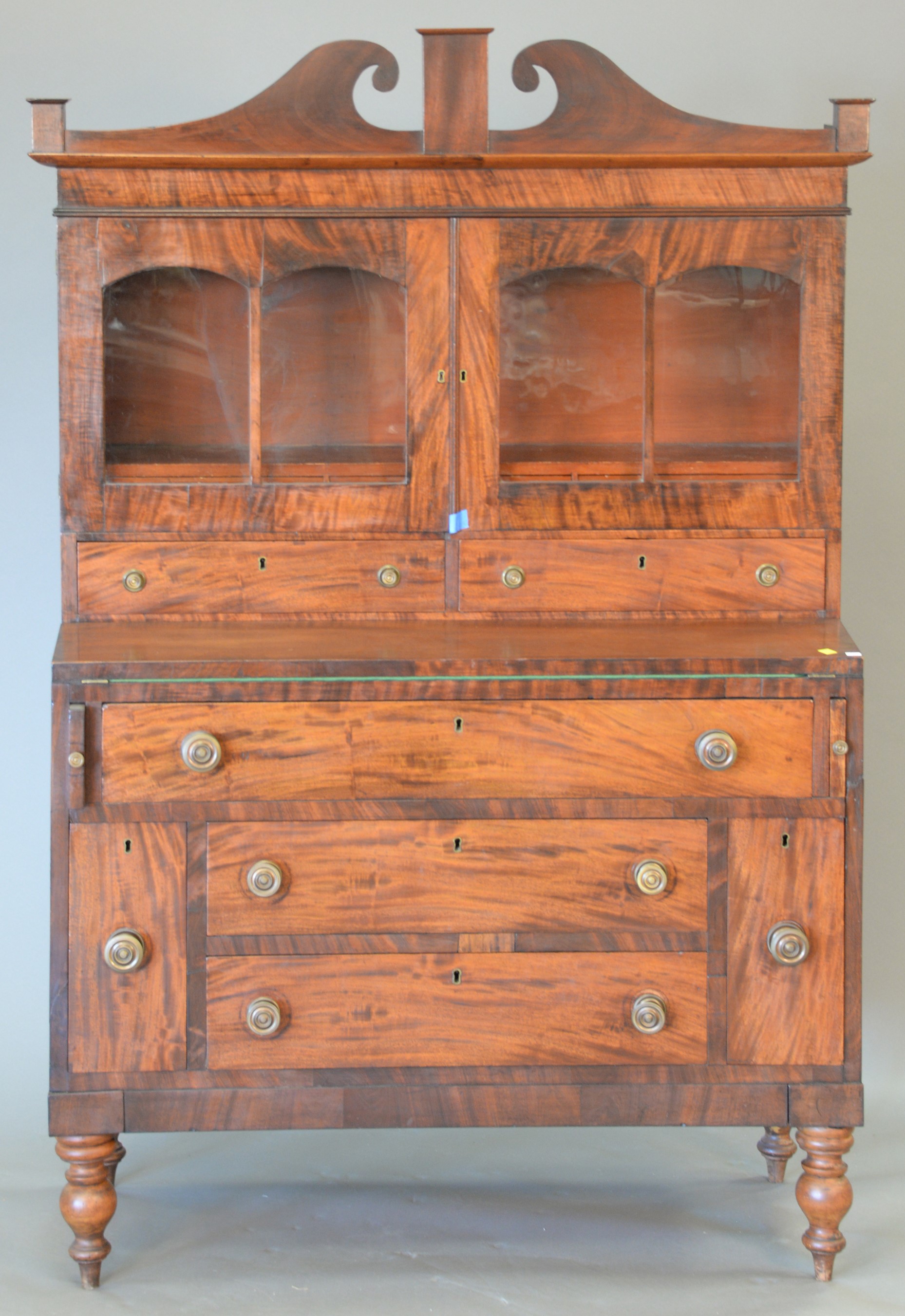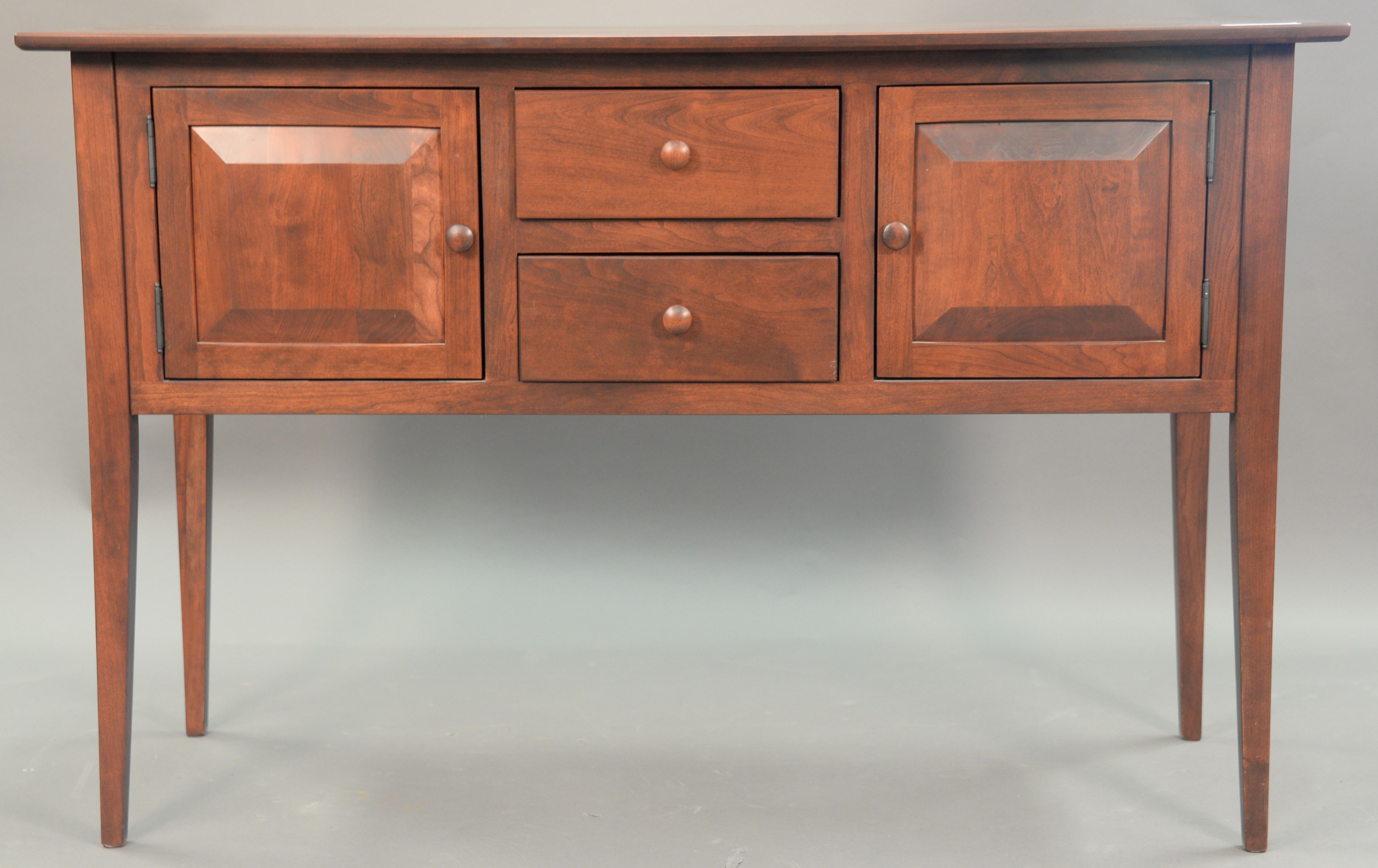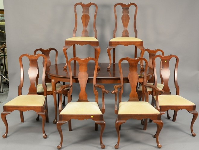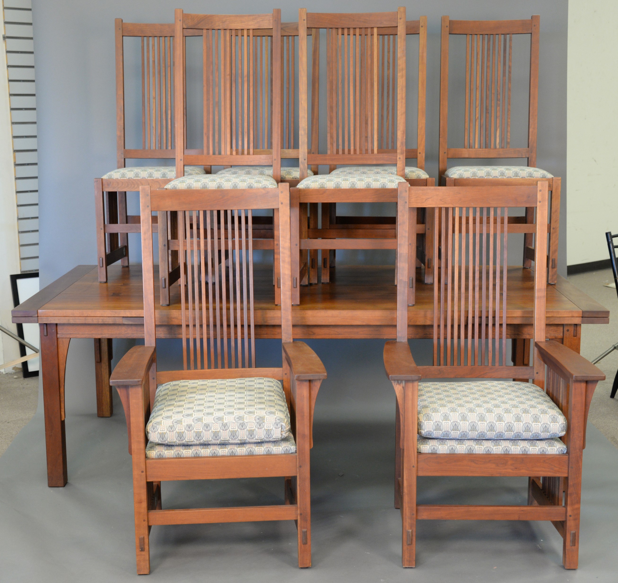 Stickley cherry nine piece dining set with eight spindle back chairs and extension table with two 21 inch leaves. ht. 29 in. top: 42 x 90, open: 42 x 132.