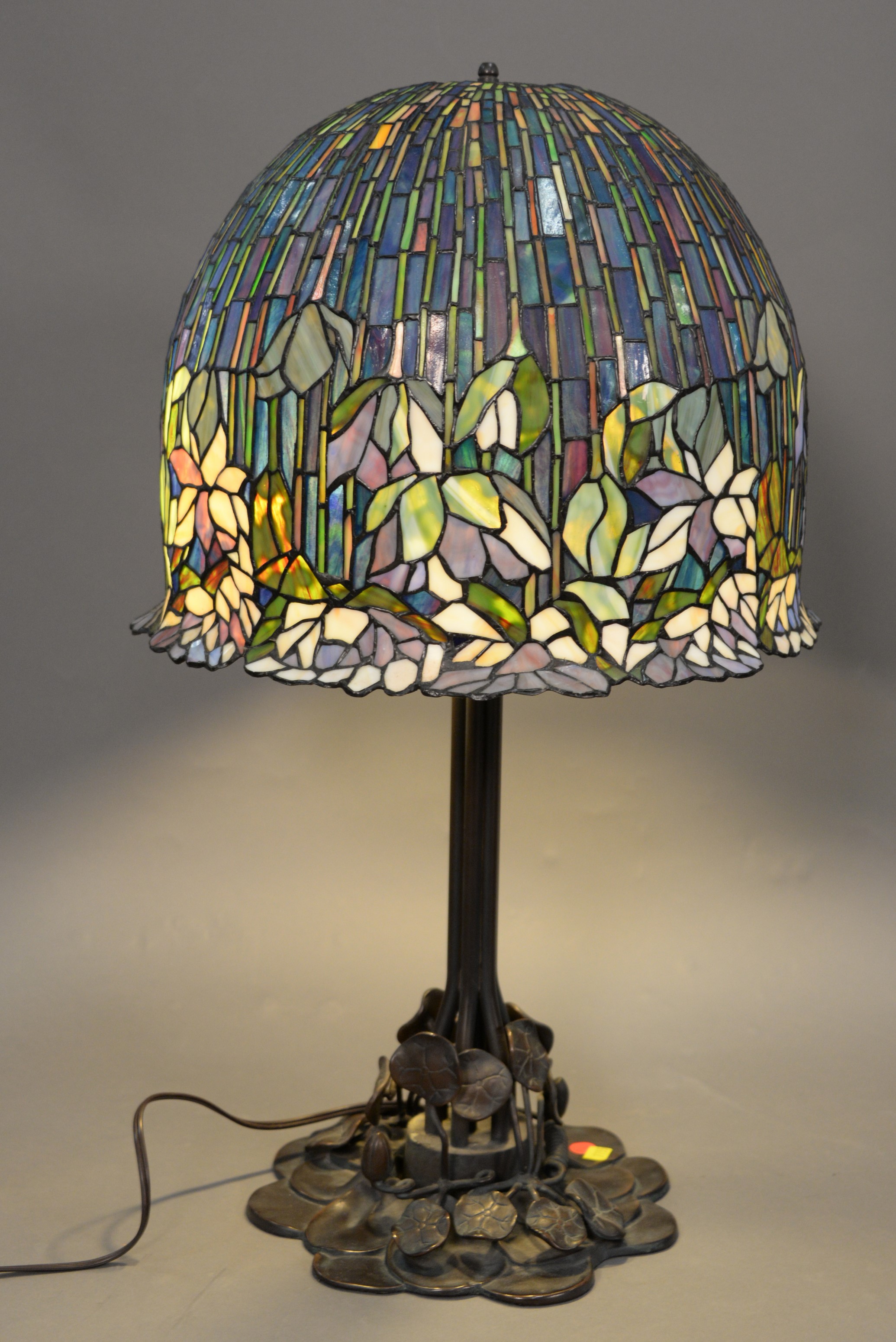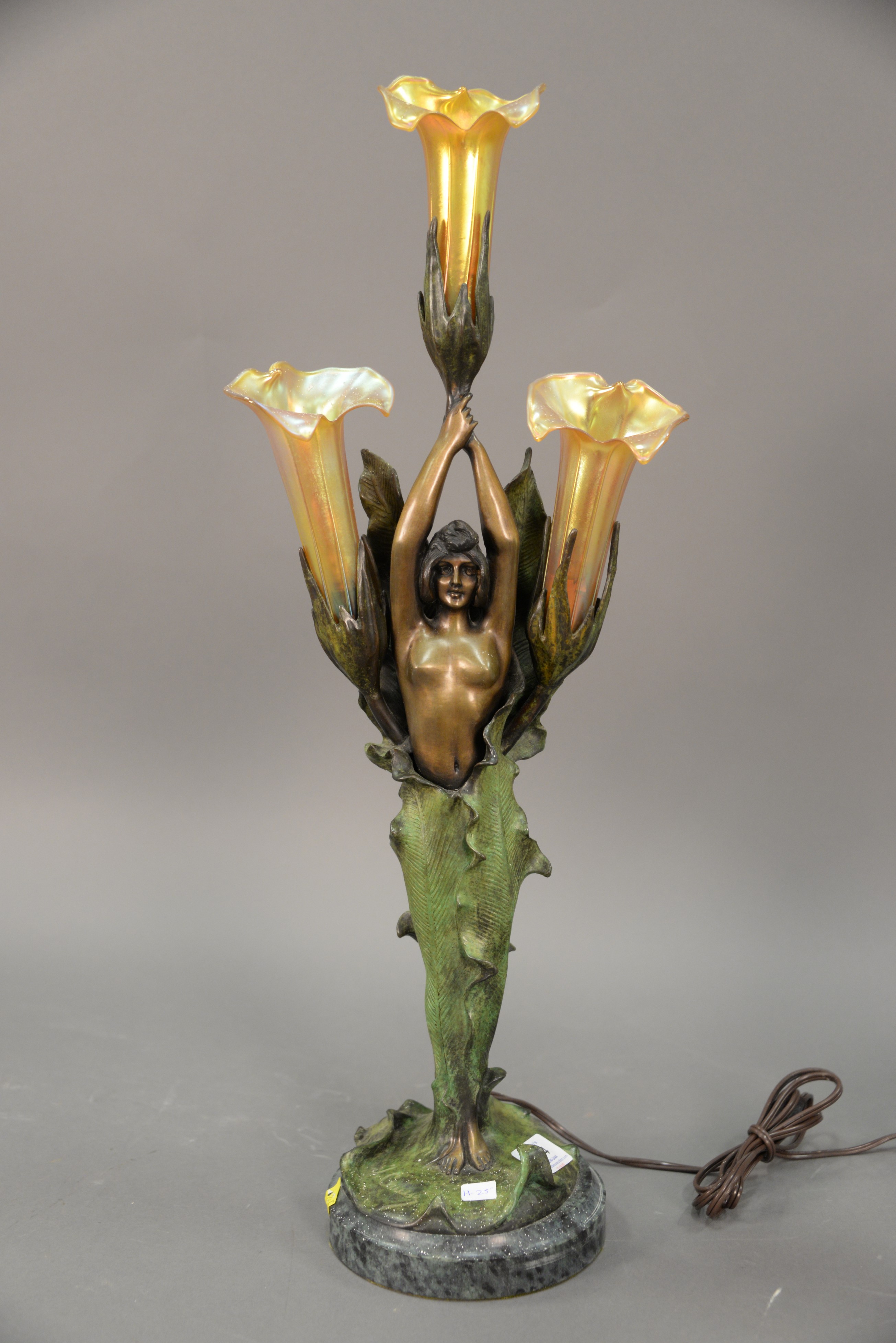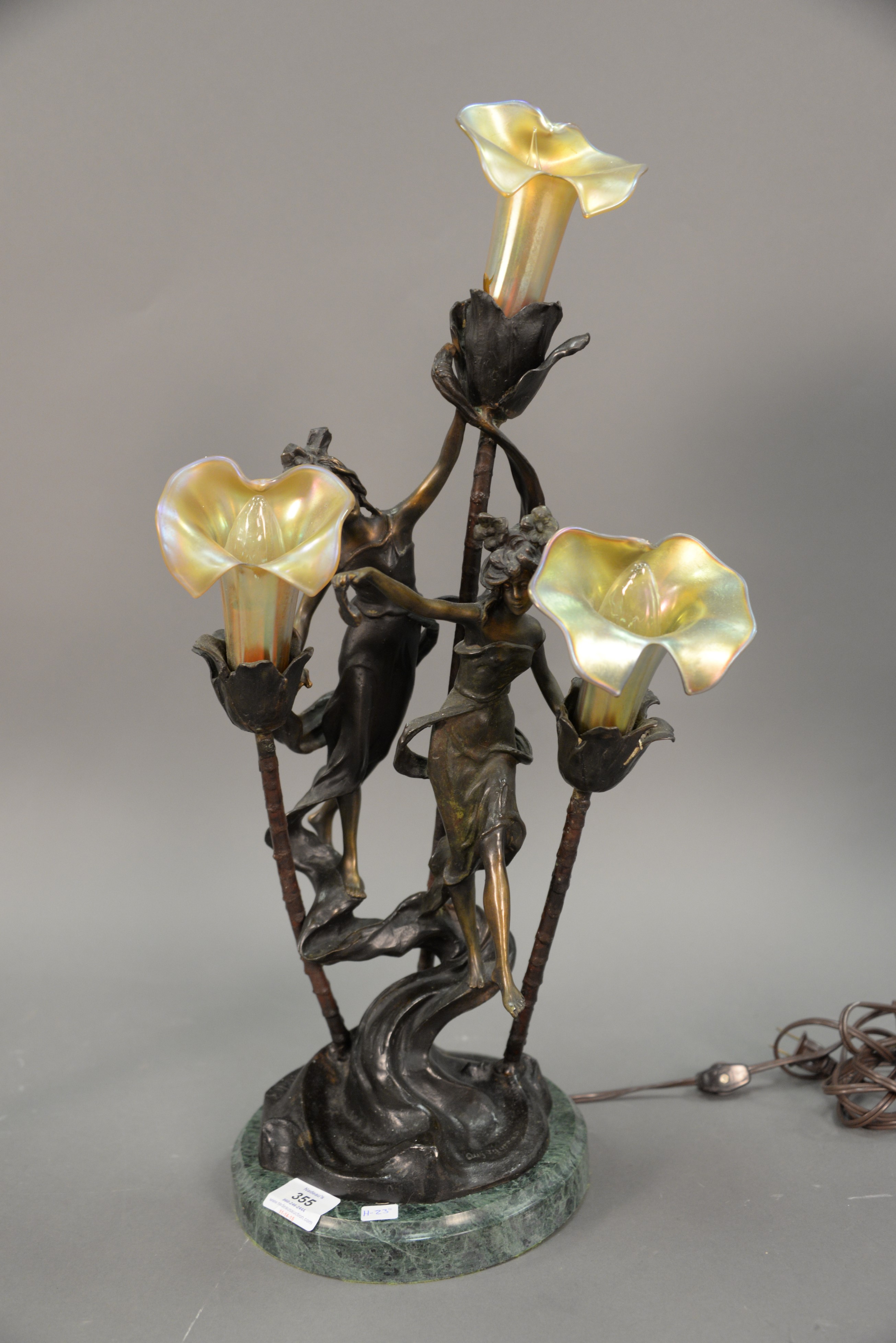 After Julien Causse 1869-1914 Art Nouveau bronze figural lamp, three light with iridescent shades, inscribed signature on raised marble base. ht. 25 in.