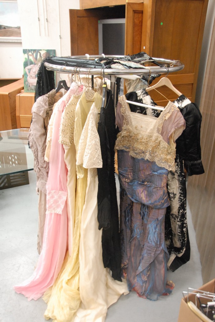 Large lot of Victorian and vintage woman’s clothes to include a 7 piece group of black clothing, silk tops and skirts, lace and silk, several dresses, one dress with beading and sequins