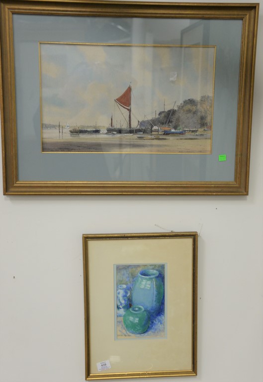Two piece lot to include Ethel Paxson 1885-1982 mixed media on paper still life with two vases signed lower left Ethel Paxson ss 8 1/2 x 5 1/2 and a watercolor Lowtide East Coast Suffolk signed indistinctly 1988 ss11 1/2 x 18 1/2.