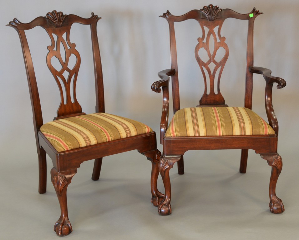 Henkel Harris set of eight mahogany Chippendale style dining chairs with ball and claw feet, two armchairs and six side.