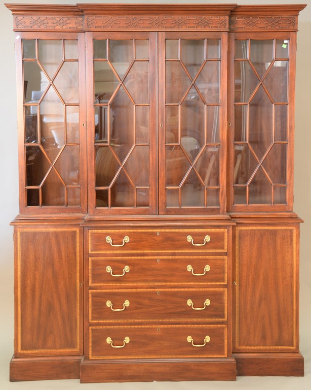 Henkel Harris mahogany breakfront in two parts with glass shelves two small shelves with small crack and one small shelf missing. ht. 82in., wd. 64in., dp. 14in.