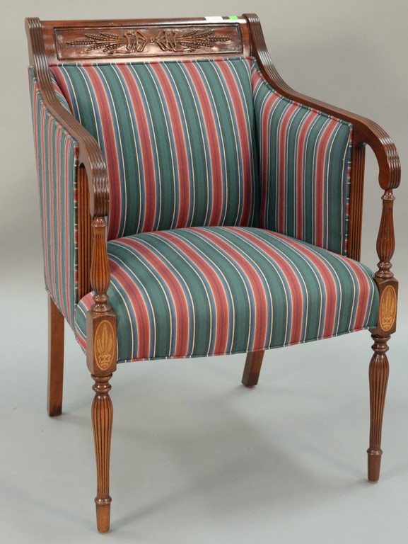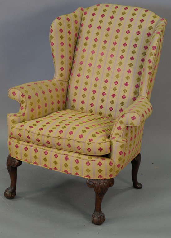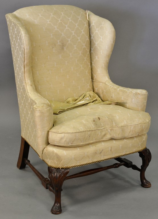 Custom mahogany Queen Anne style wing chair having shell carved knees and stretcher base.
