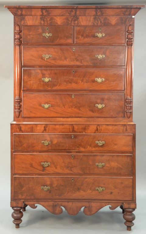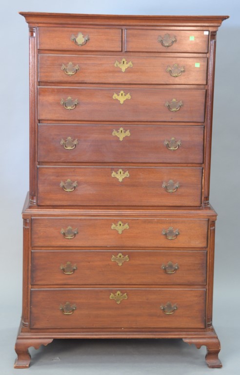 Mahogany chest on chest having two over four drawer top resting on three drawer base. ht. 66in.,wd. 37in.