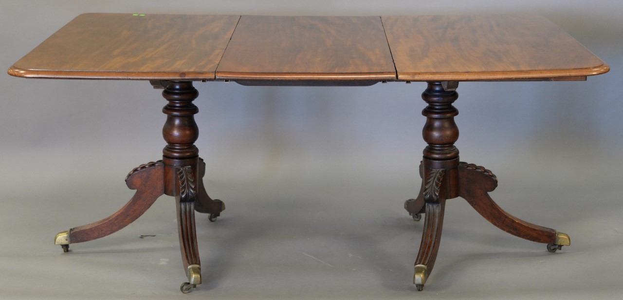 Continental mahogany double pedestal dining table with two 20 leaves. ht. 29in., top closed: 43 x 46, top open: 43 x 86