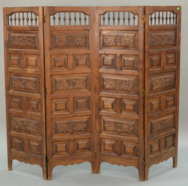 Carved wood four fold dressing screen. ht. 59in., wd. 68in.