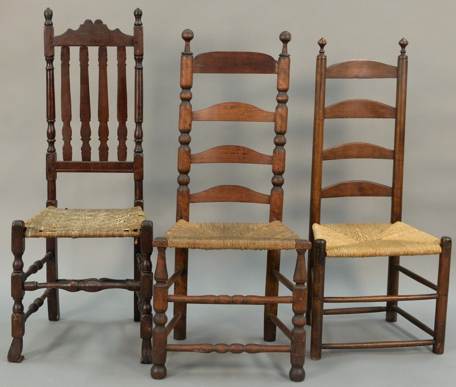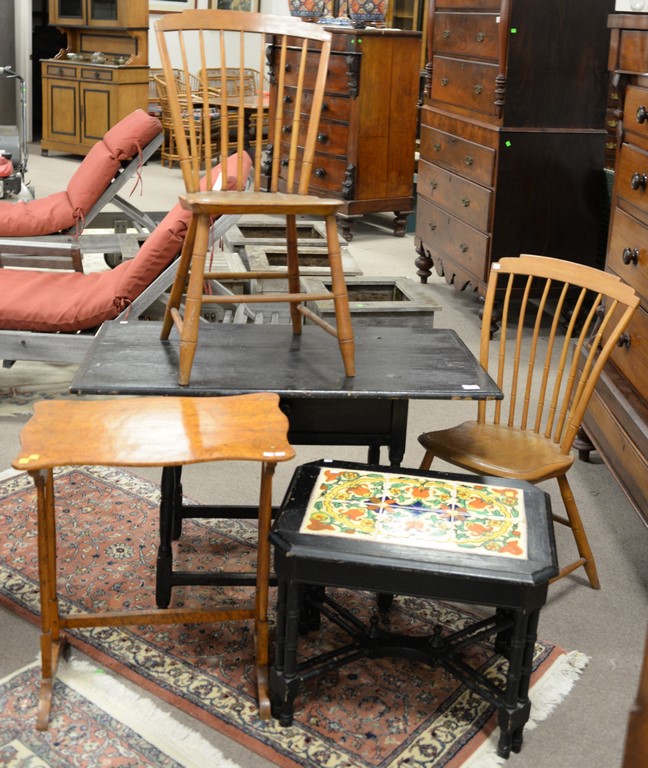 Group lot with primitive tavern table, birdseye maple table, tile top table, and pair of stepdown Windsors, 18th century. ht. 25in., top: 25 x 41
