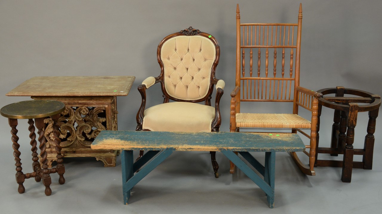 Six piece lot to include carved table, rocker, blue bench lg. 50in., two small stands, and Victorian gents chair.