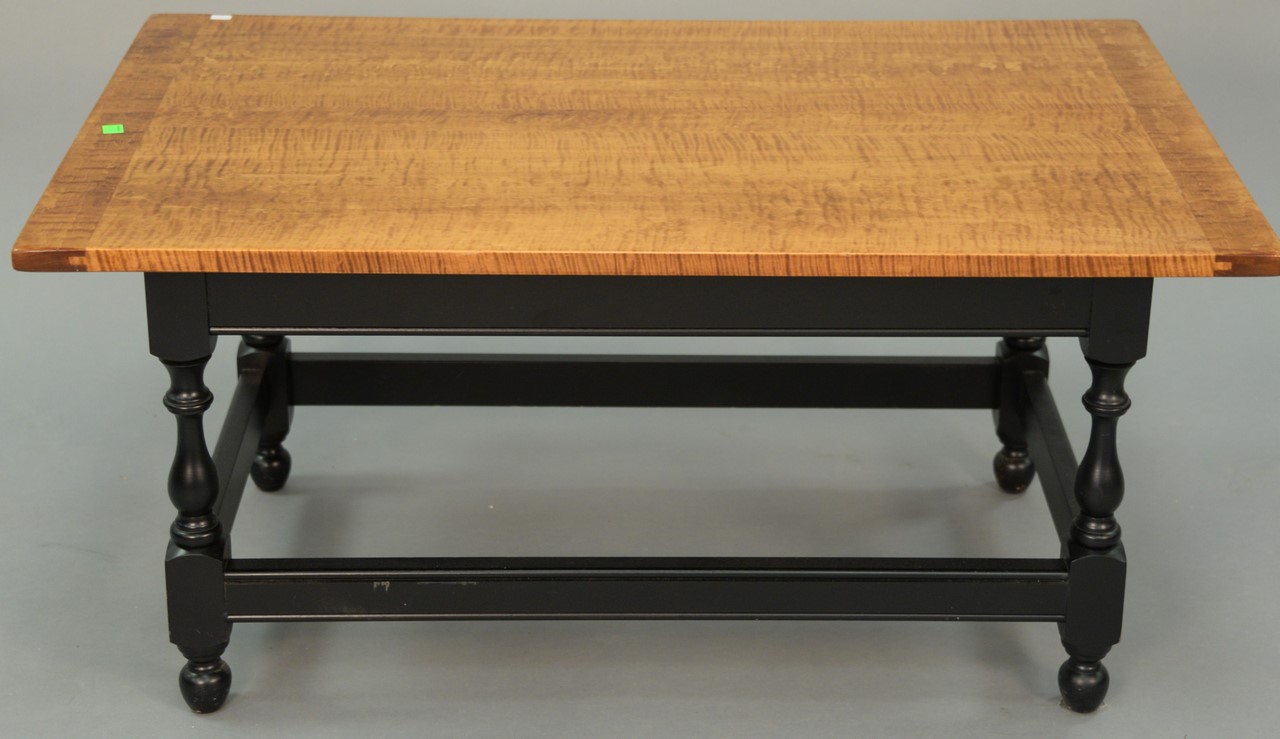 Custom tiger maple coffee table having tiger maple breadboard top over turned leg base, possibly Dimes. ht. 18in., top: 38 x 24.
