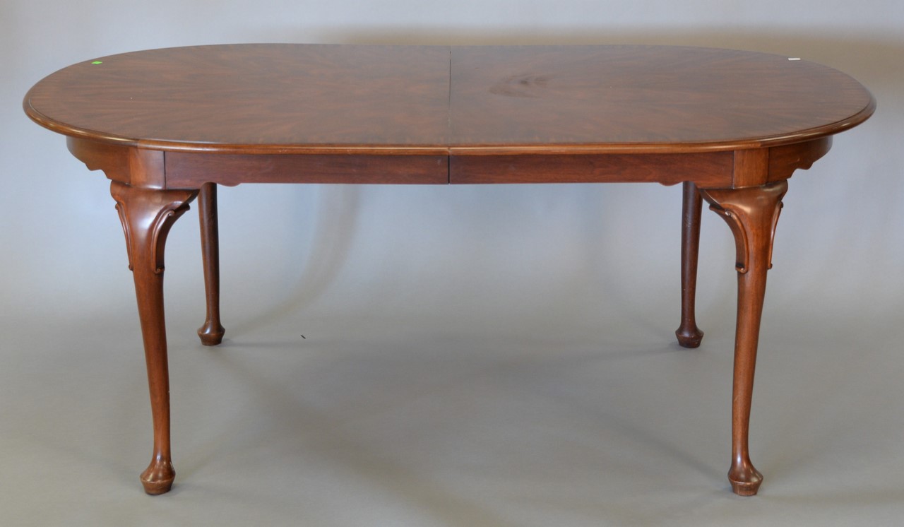 Henkel Harris mahogany oval dining table with banded inlaid top and two leaves, top: 47 x 70, opens to 102.
