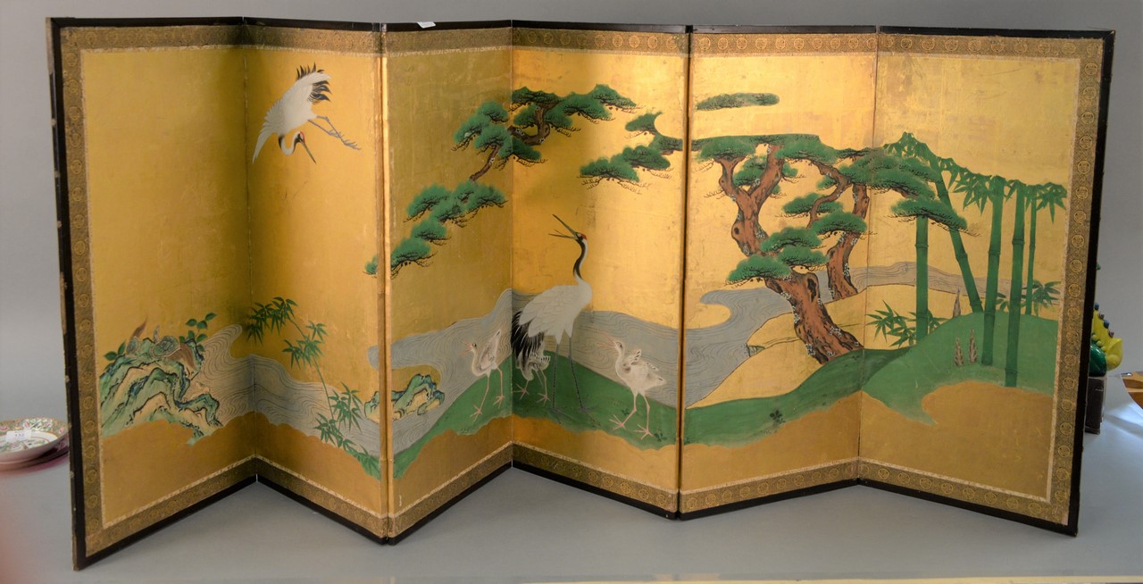 Japanese Kano school six panel folding screen, 19th century screen depicting cranes, pines, and bamboo on a river bank. ht. 29 1/2in., wd. 67 1/2in. Provenance: Property from Credit Suisse’s Americana Collection
