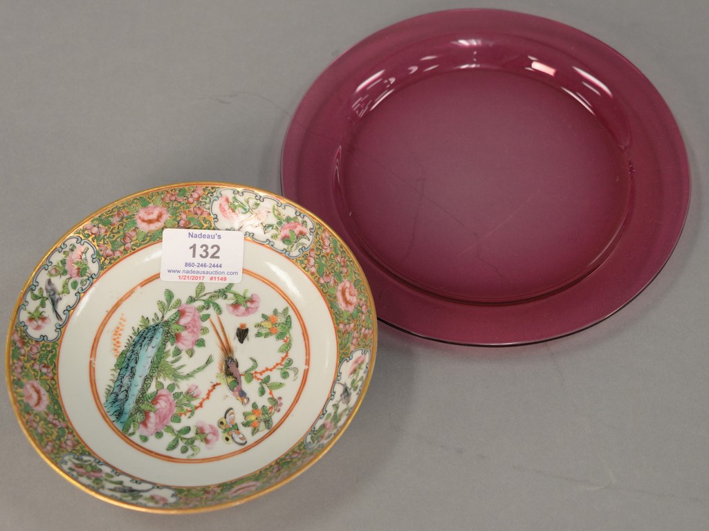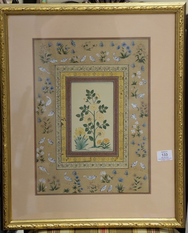 Mixed media Asian painting with birds and flowers having gilt border, sight size 15 x 11. Provenance: Property from Credit Suisse’s Americana Collection