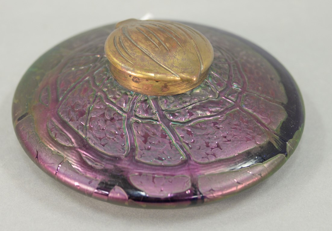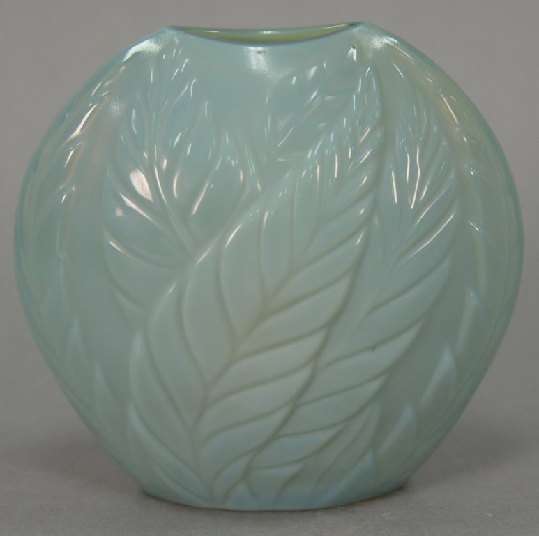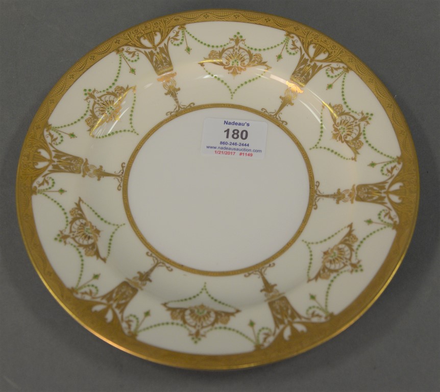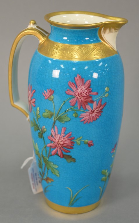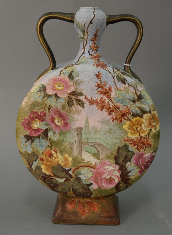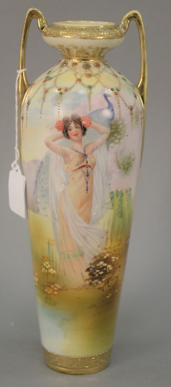 Nippon scenic jeweled porcelain vase with hand painted scene of a woman in landscape under jeweled top with handles, marked Nippon hand painted on bottom, hairline crack running through body of vase ht. 12in.