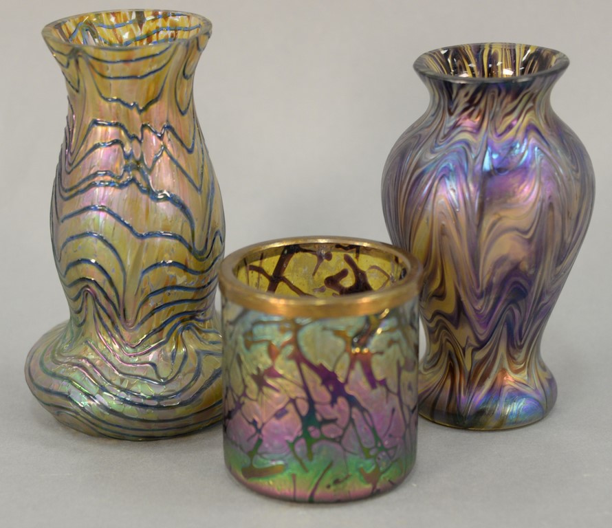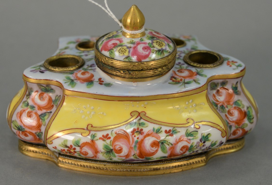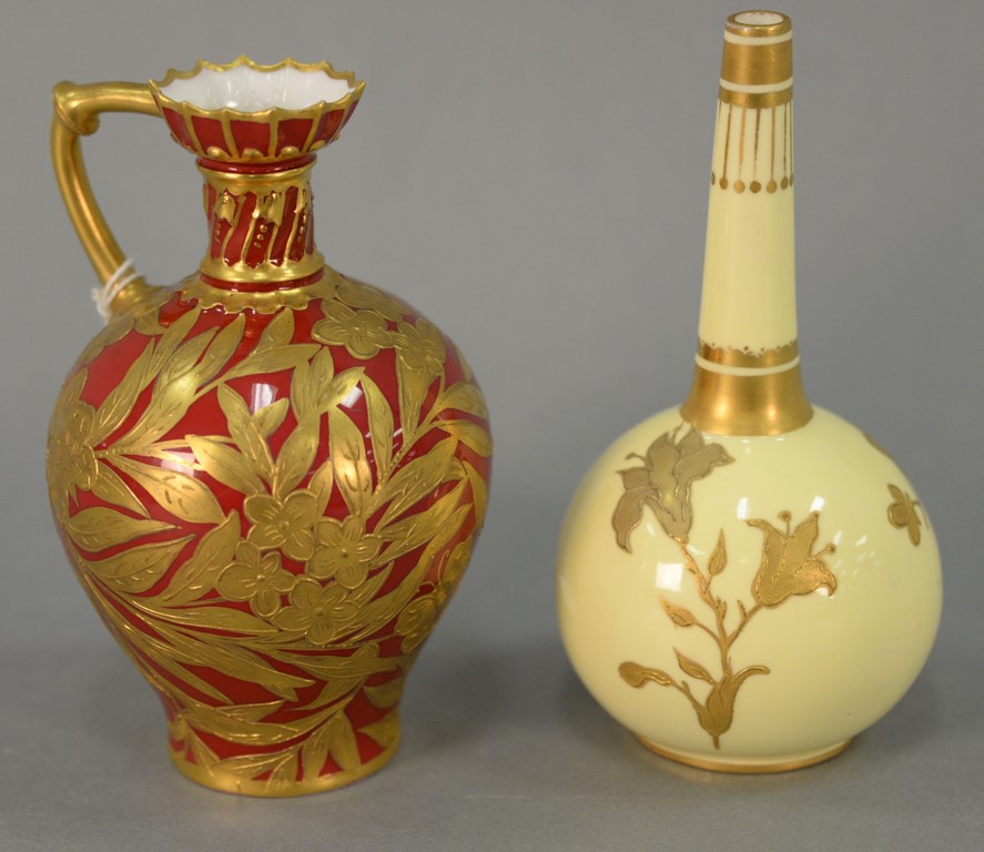Two Royal Crown Derby porcelain vases, 19th century, one having red ground decorated with gilt flowers and leaves and the other yellow with gilt decoration. ht. 4 1/2in. & 4 3/4in.
