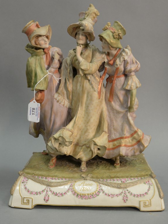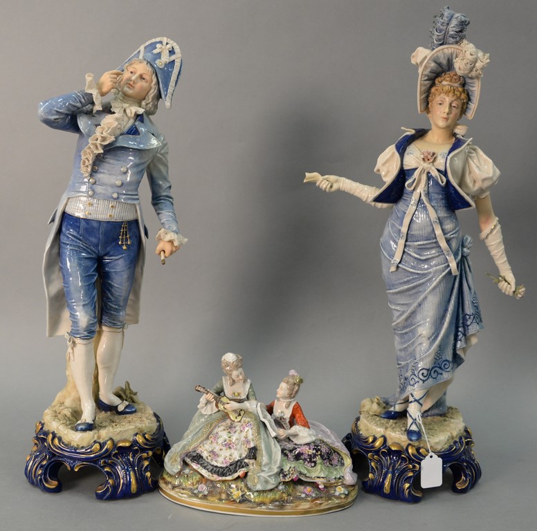 Three porcelain figurines including a pair of large English porcelain figurines a Victorian man and woman blue and white with gilt decoration ht. 22in. man repaired and a double figure of two women with instruments repaired ht. 7in., wd. 9 3/4in.