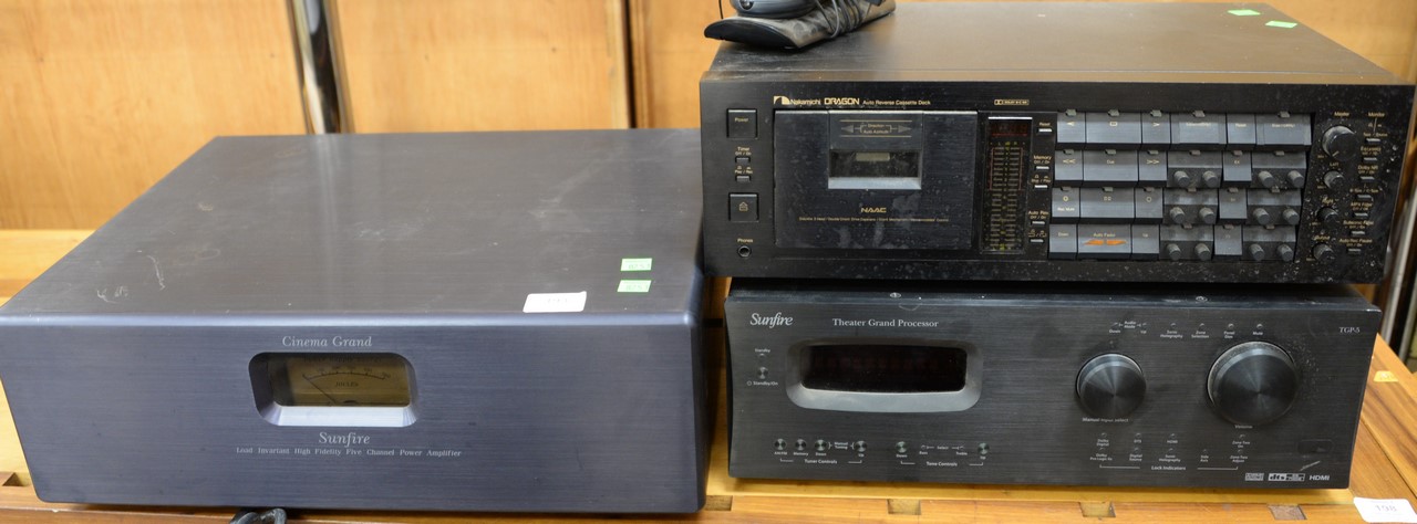 Three piece group to include Sunfire TGP-5 preamplifier surround Theater Grand Processor, Nakamichi cassette deck, and Cinema Grand Sunfire Load Invariant High Fidelity Five channel power amplifier.