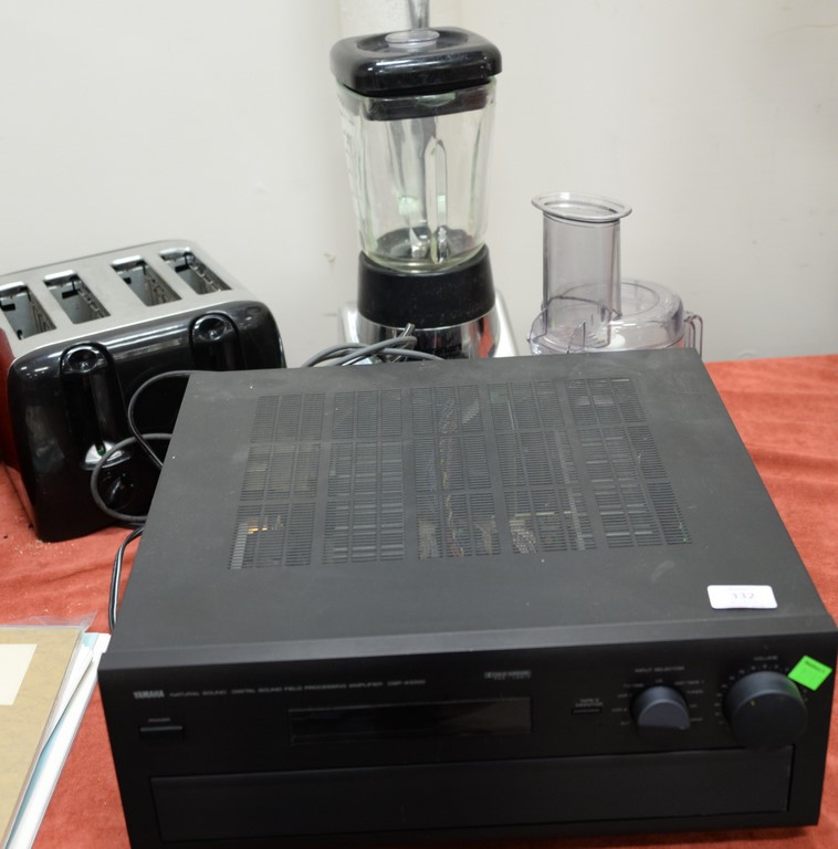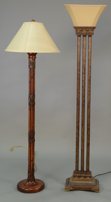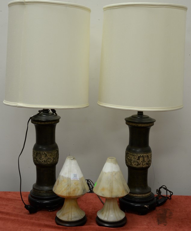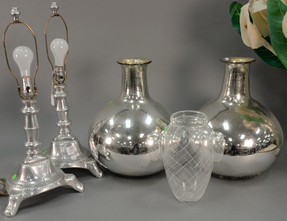 Six piece lot to include pair of mercury glass vases ht. 18in., pair of aluminum table lamps ht. 26in., glass vase of faux flowers, and an art glass vase.