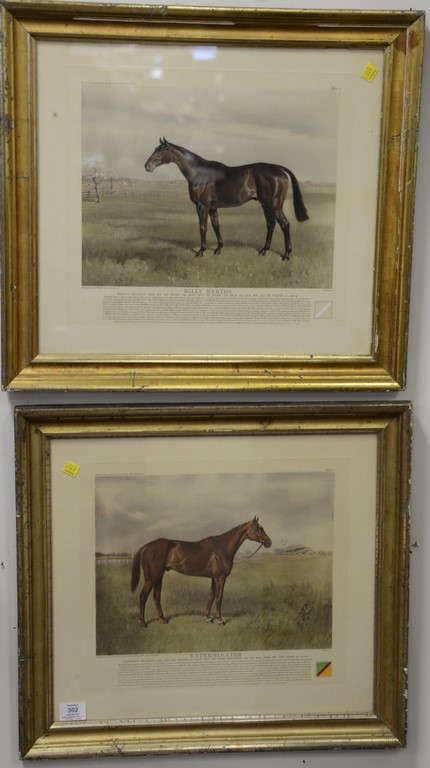 Four art glass perfume bottles to include Loetz gold iridescent threaded perfume not marked, a Michael Harris art glass perfume, a Correia gold iridescent perfume with broken stopper, and Correia pink with gold perfume with atomizer. ht. 5in. to 6in.