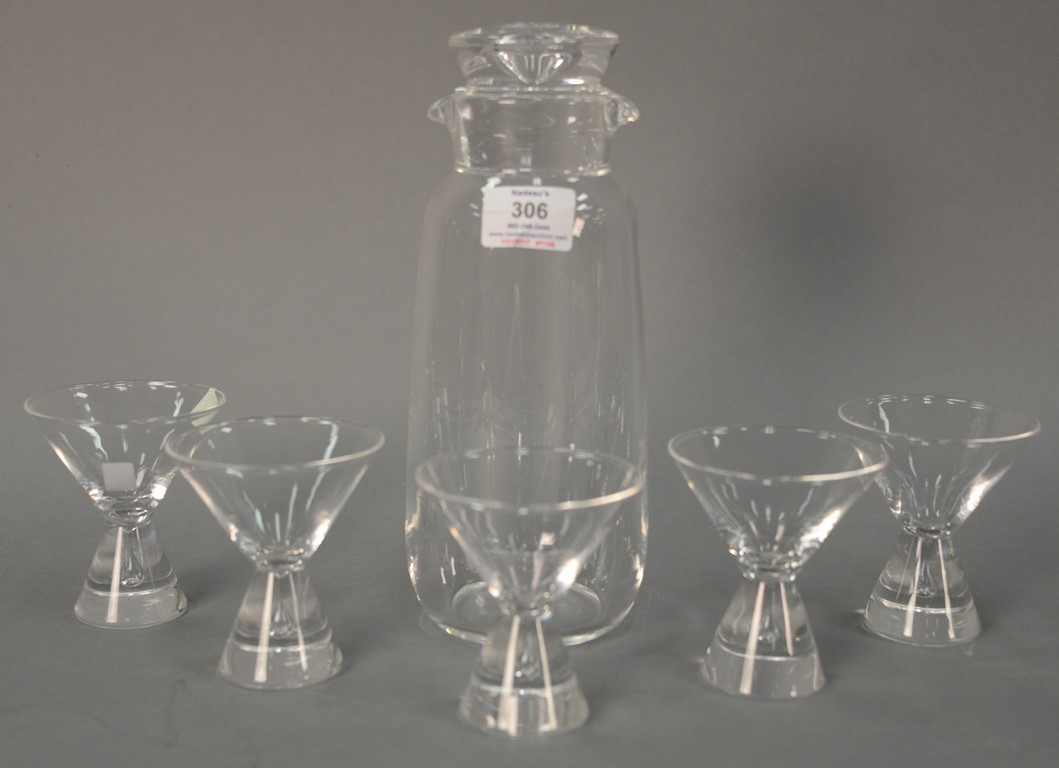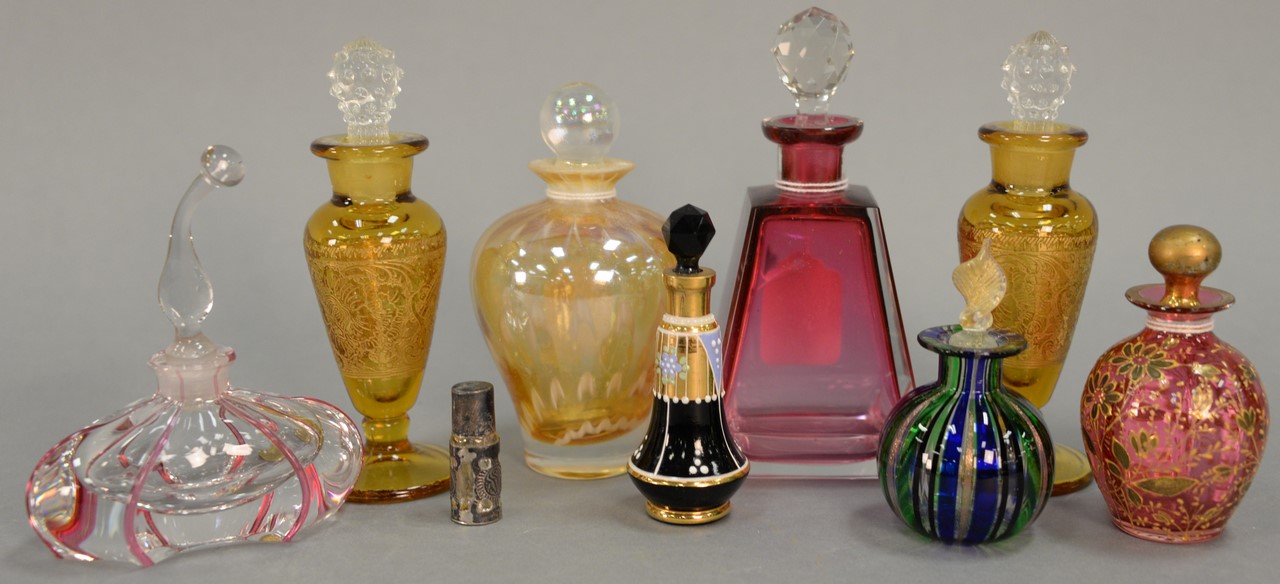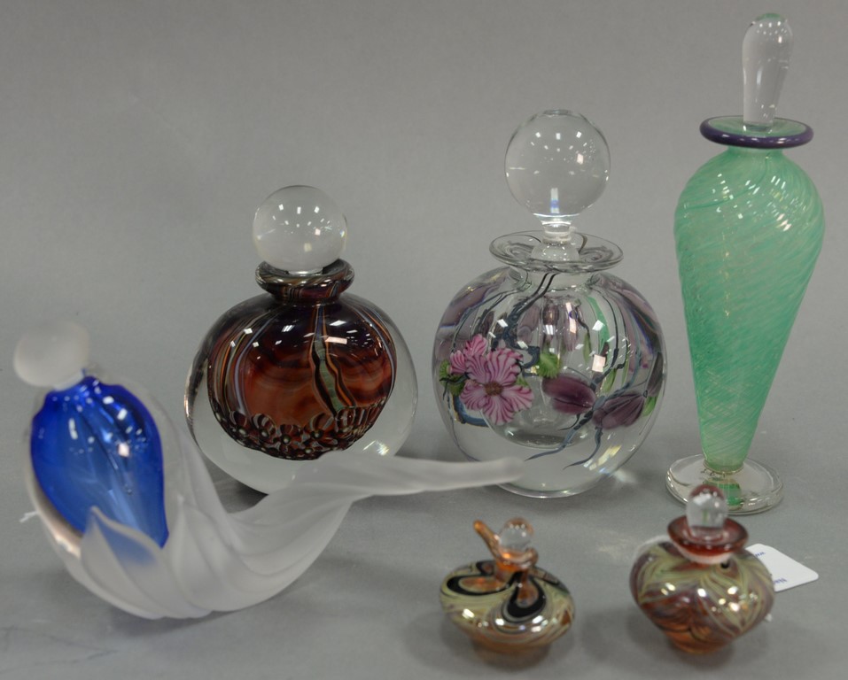 Group of six art glass perfume bottles including William Glasner art glass floral perfume signed and dated, Lundberg Studios art glass bottle with butterflies and flowers, two small Stacey art glass bottles, an art glass bottle with broken stopper signed indistinctly on bottom, and a green with purple perfume with stopper signed indistinctly. ht. 1 1/2in. – 7in.