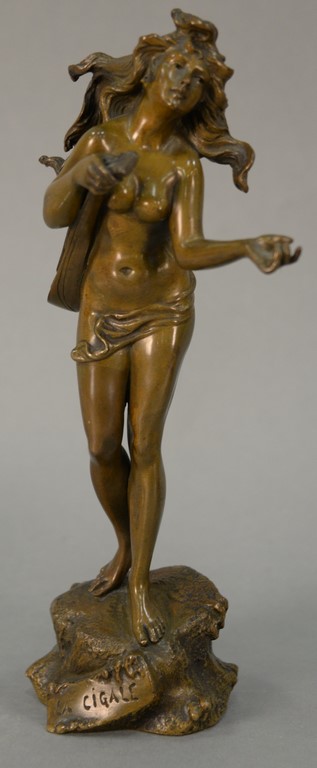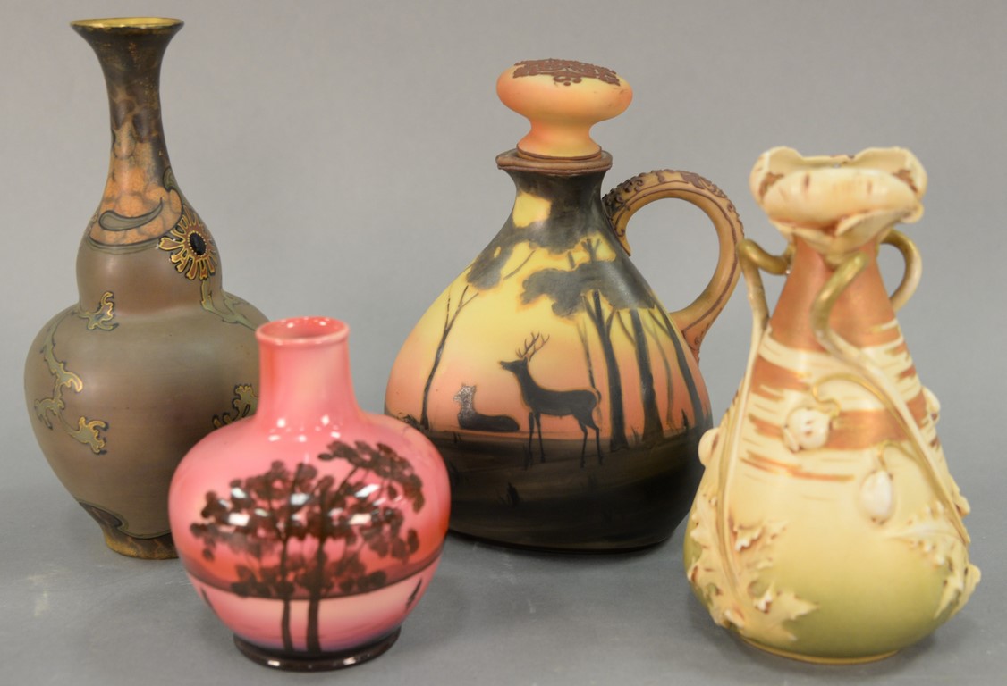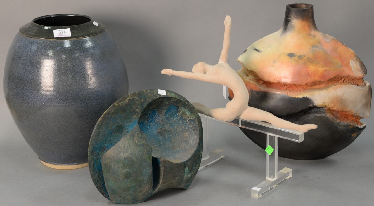 Four piece group to include Austin Prod sculpture of a gymnast, Daniel Rosenbaum Lost City bronze, and two large ceramic vases. ht. 10 1/2in. to 15 1/2in.