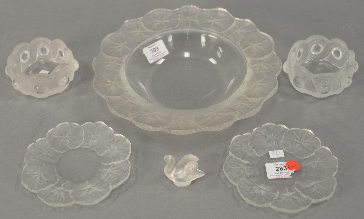 Group of six Lalique crystal pieces including large dish with frosted leaf border dia. 10 1/2 and matching small dishes, pair of small bowls, and small Lalique frosted swan ht. 2in..