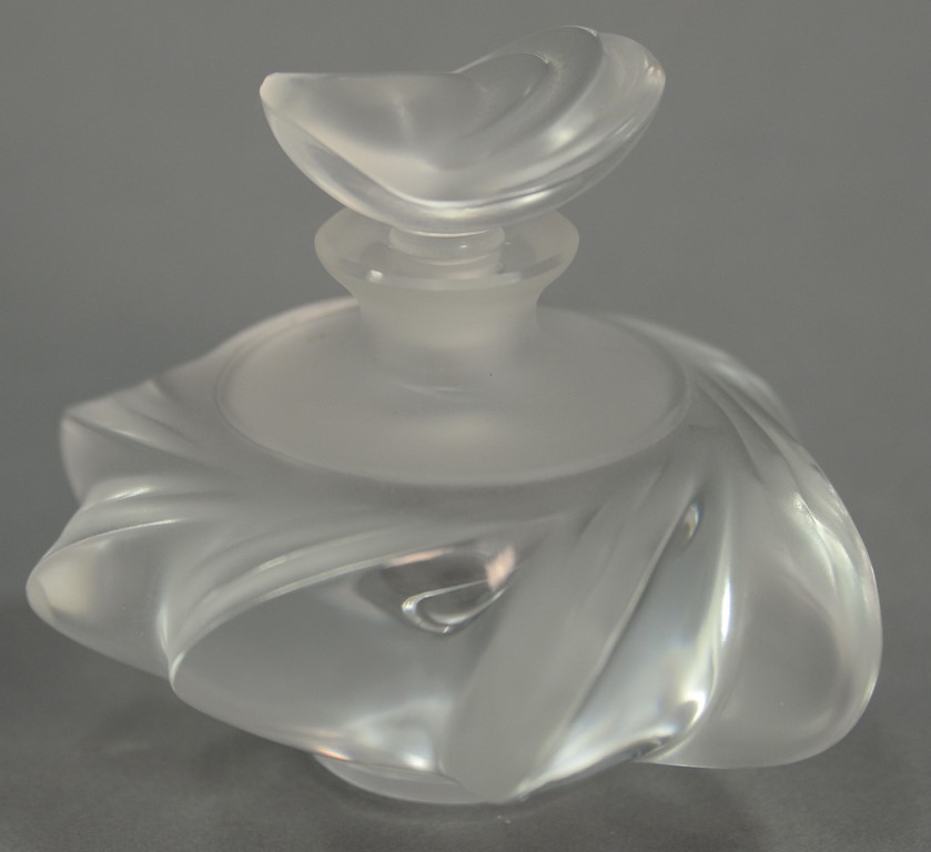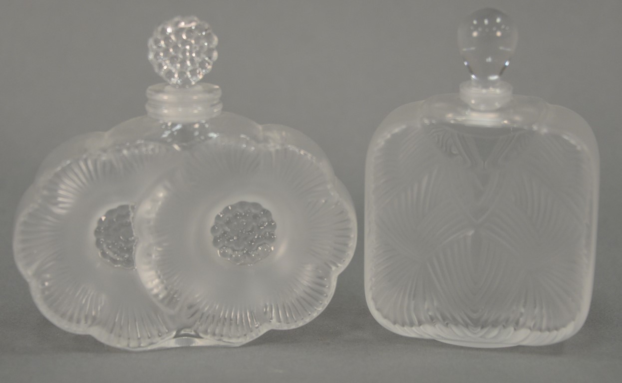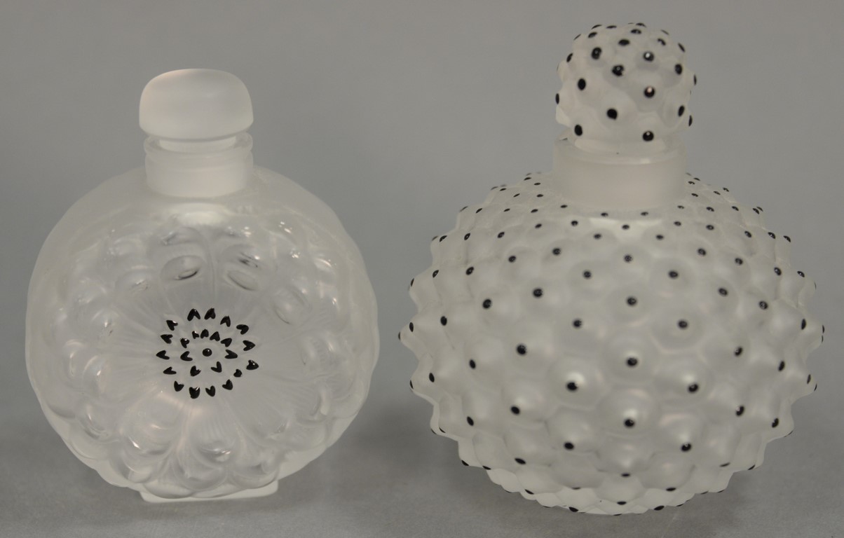 Two Lalique perfume bottles, crystal Dahlia perfume bottle marked Lalique having frosted glass and black enamel center ht. 3 1/2in. and Cactus frosted with black enamel ht. 4in.