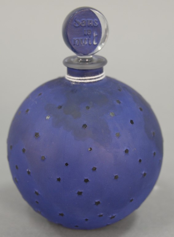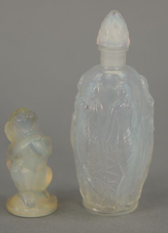 Two piece lot to include Sabino France art deco glass perfume bottle, opalescent with five figures crystal marked Sabino France and a Sabino opalescent dog. ht. 2in. to 4in.