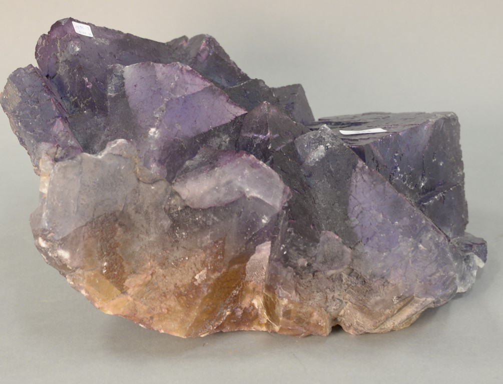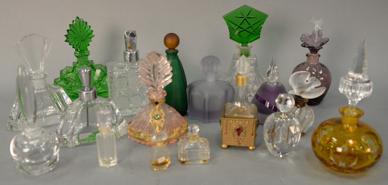 Tray lot of 18 crystal perfume bottles including Empire art gold perfume, pink crystal perfume mounted with brass and jewels, green crystal perfume, small perfumes, and Two’s Company perfume, etc. ht. 1 3/4in. to 6 1/2in.