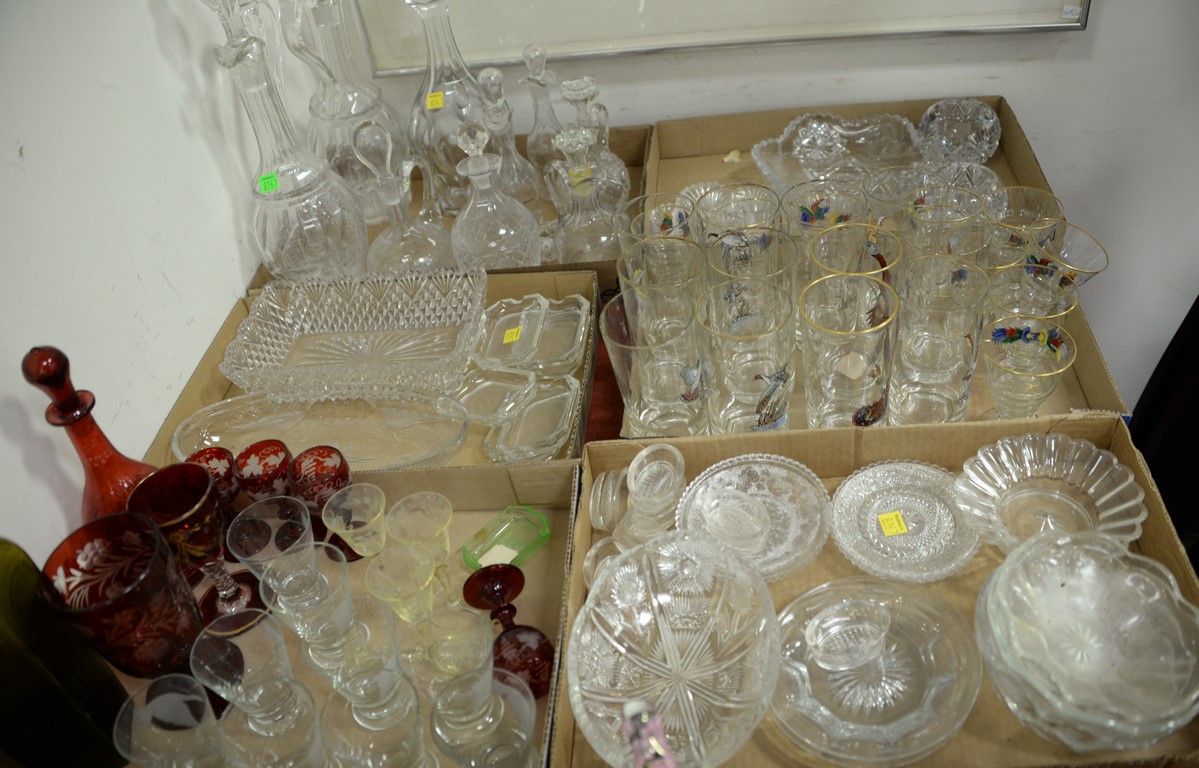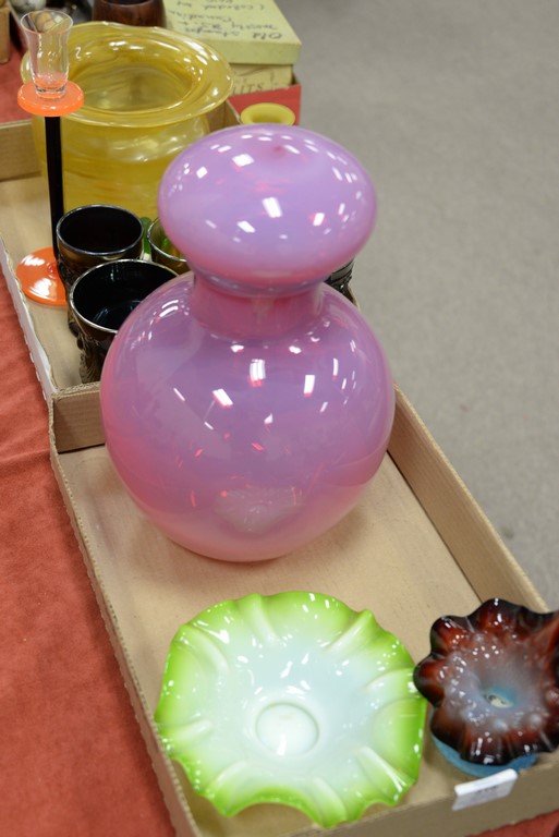 Two boxes of art glass to include a large bottle with stopper plesl candlestick, five carnival glass cups, Fenton Jack in the Pulpit vase, and small dish with ruffle rim. ht. 3in., to 12 1/2in.