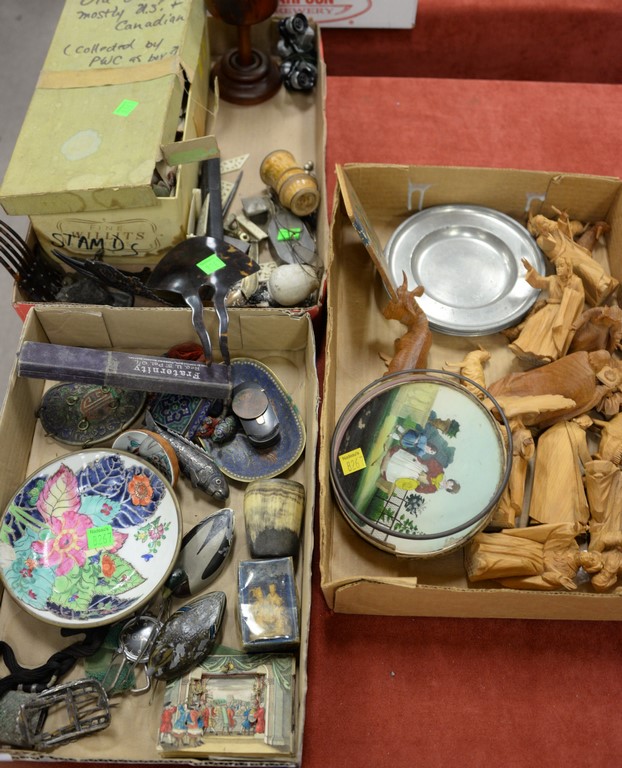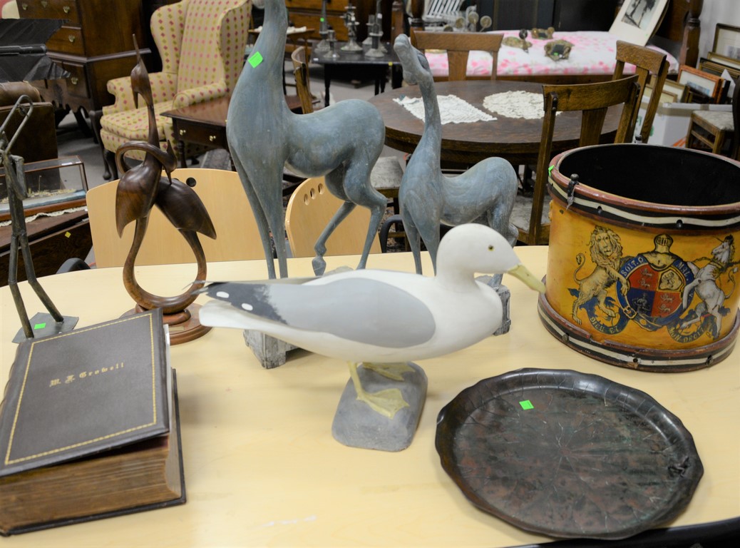Seven piece group to include carved seagull, pair of carved animals signed D.J., courtship of cranes carved sculpture, bronze lilypad tray with small frog on it, an antique drum, and The Eagle and Brooklyn book. carved animals 29 1/2 and 21