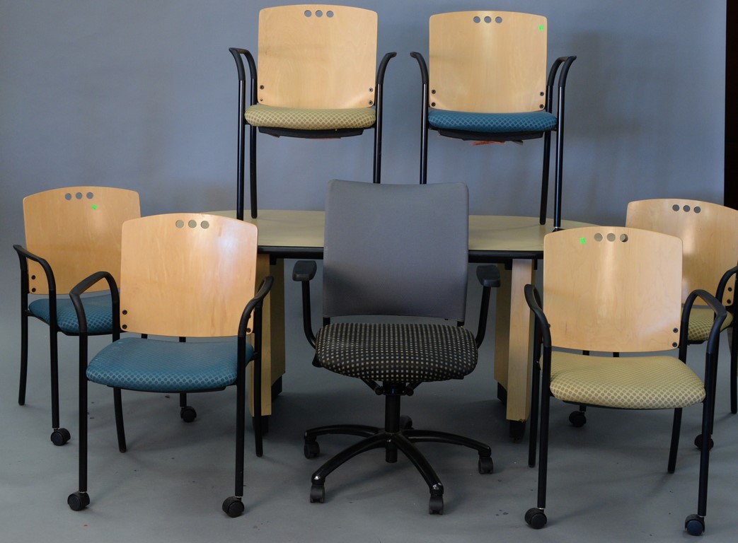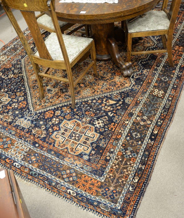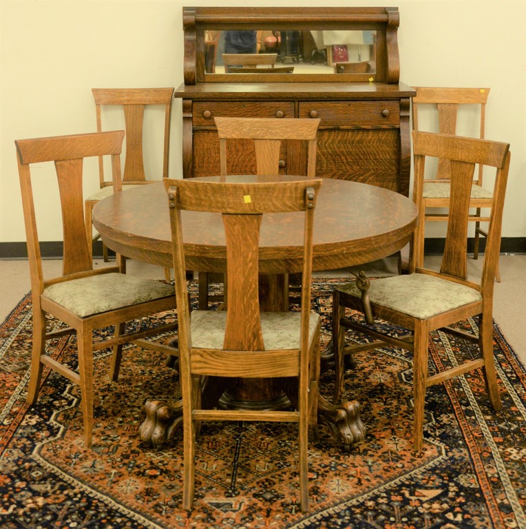 Eight piece oak Victorian dining set with round claw foot table and 3 leaves, six T back chairs, and sideboard. table ht. 29in., dia. 45in., with three 10inch leaves
