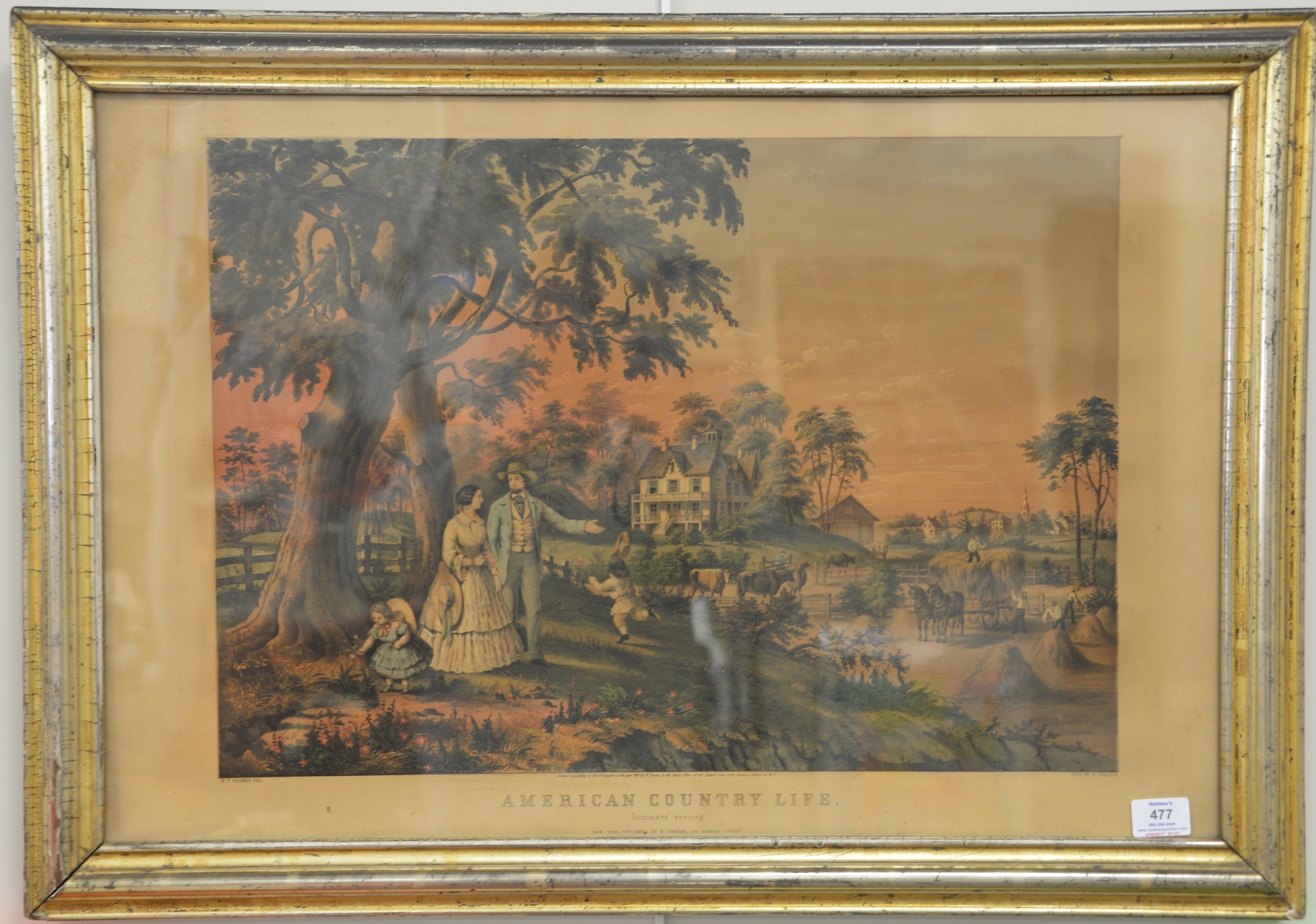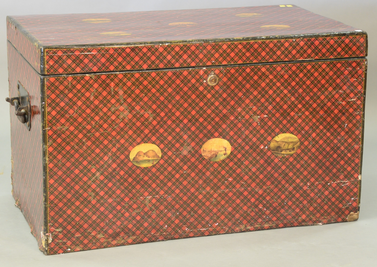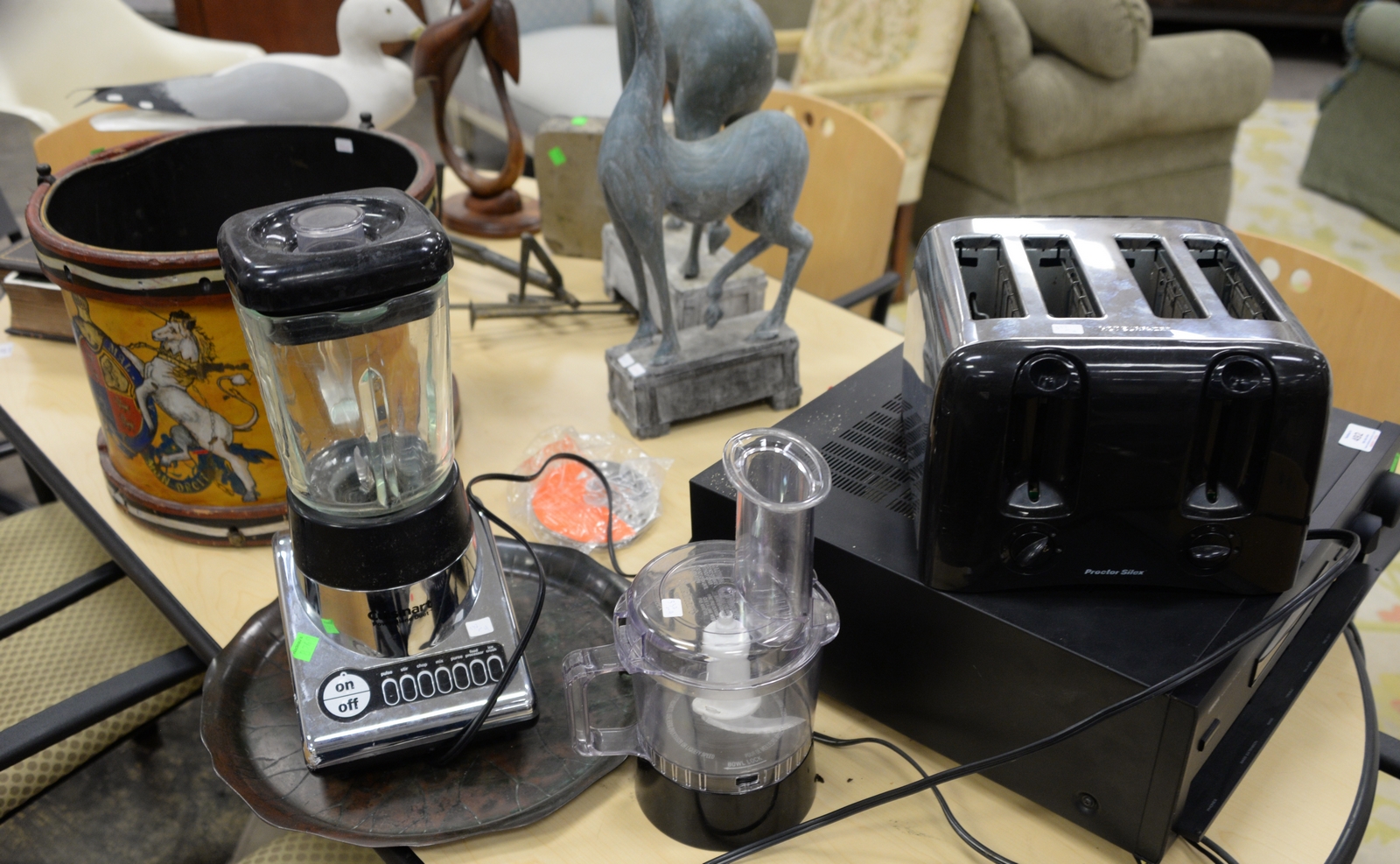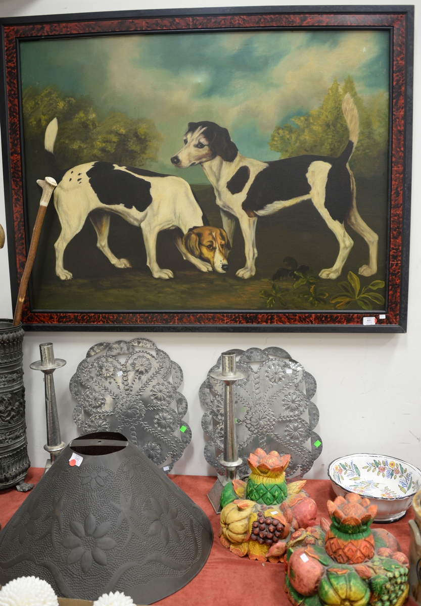 Large group to include a 20th century primitive style painting with two dogs 35 x 48 and a large group of tole and tinware to include three candlesticks, pair of tin sconces, tin table lamp with brass embossed lamp shade and brass embossed umbrella stand, two carved pieces ht. 10 1/2in., and a New York 2 gallon stoneware crock with blue decoration shipped ht. 9 1/2in., dia. 10in.