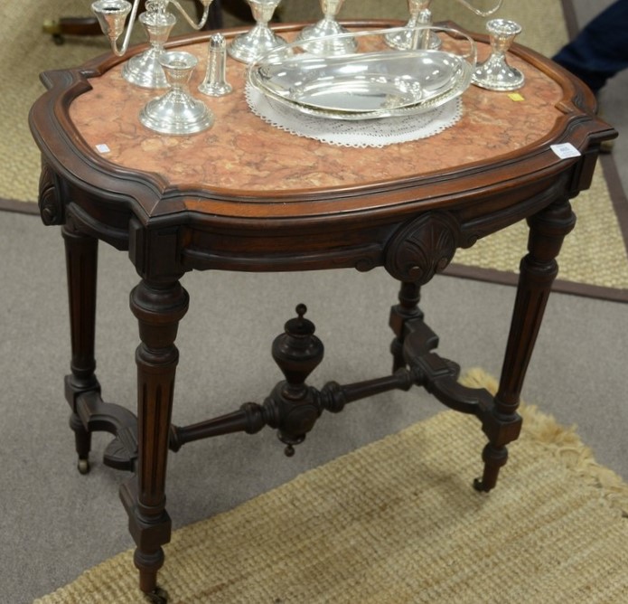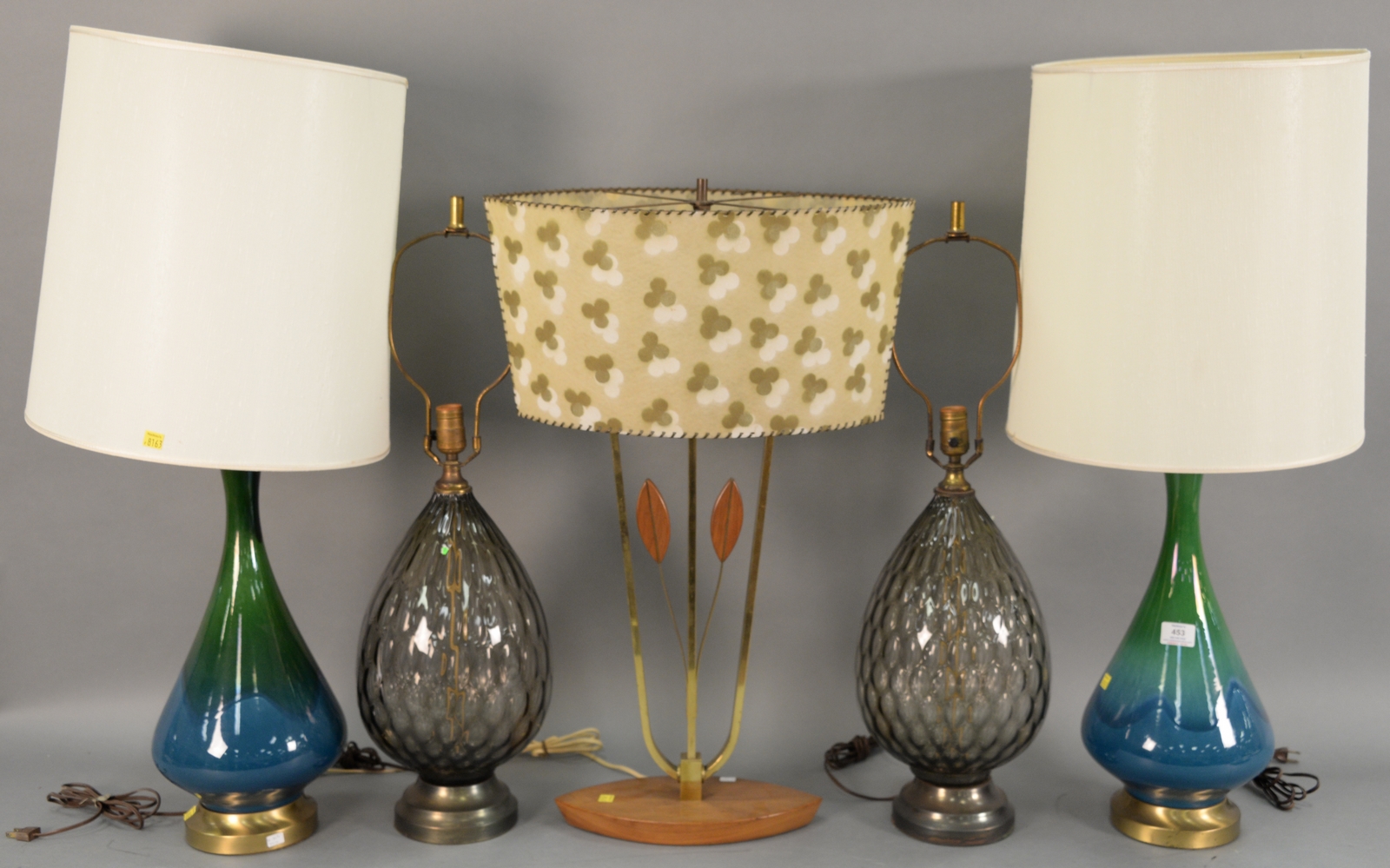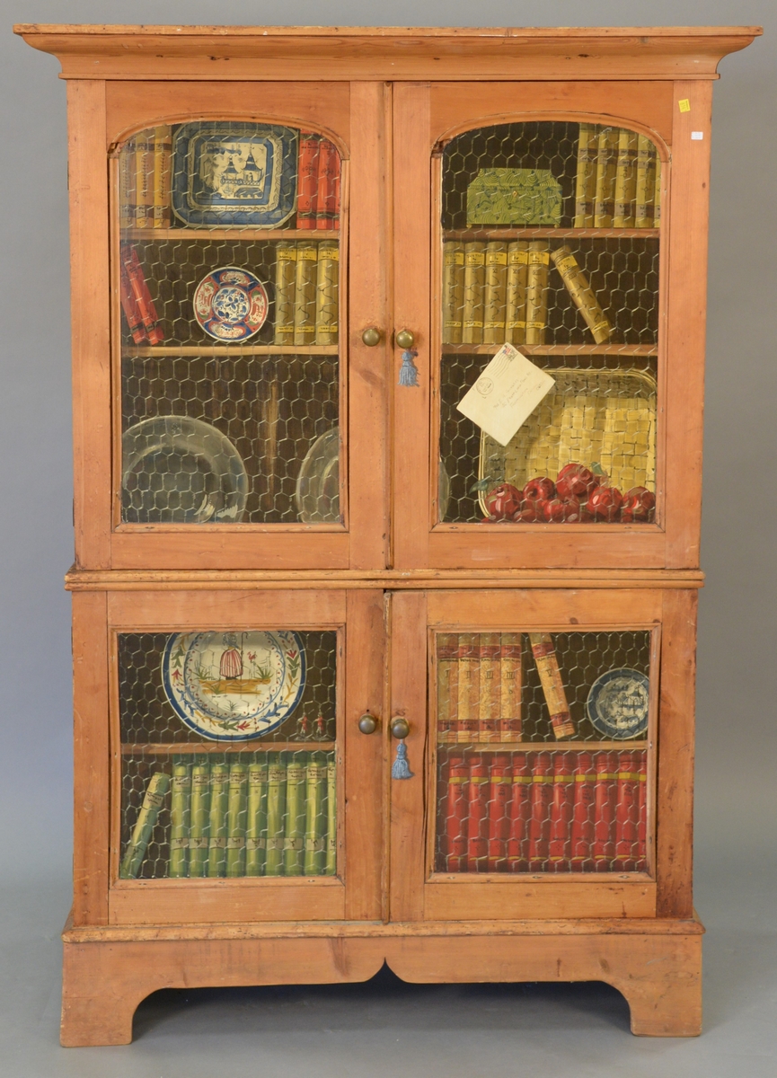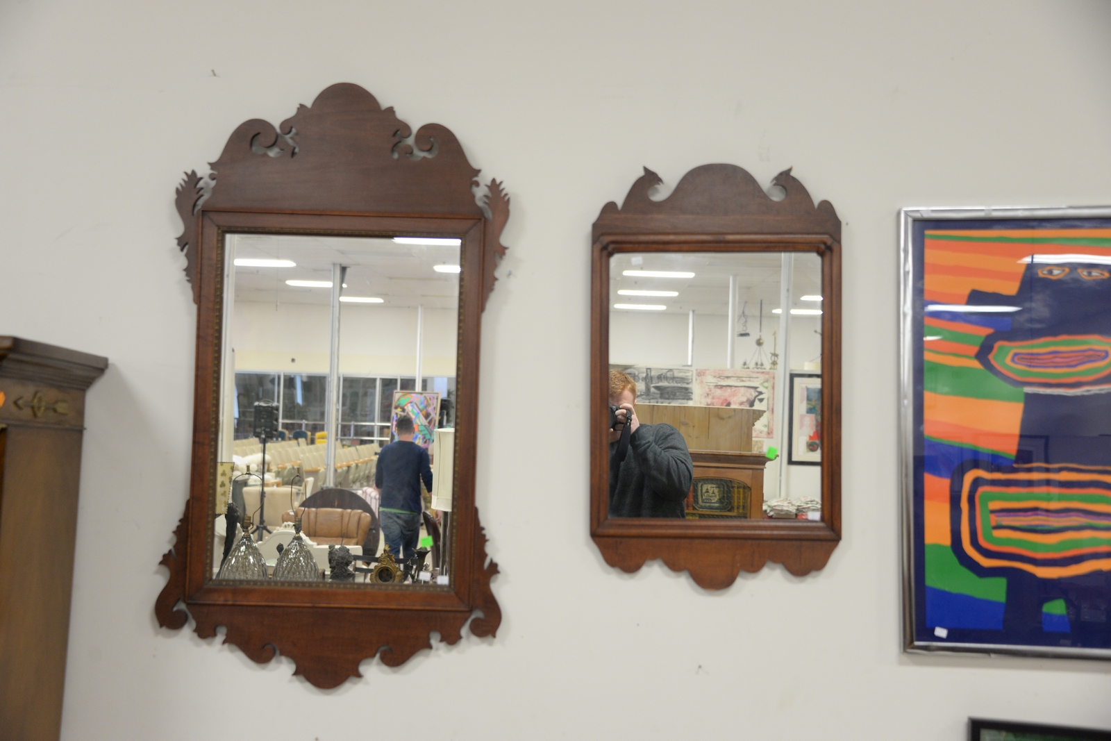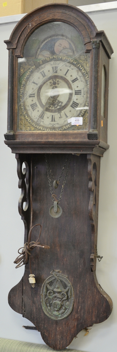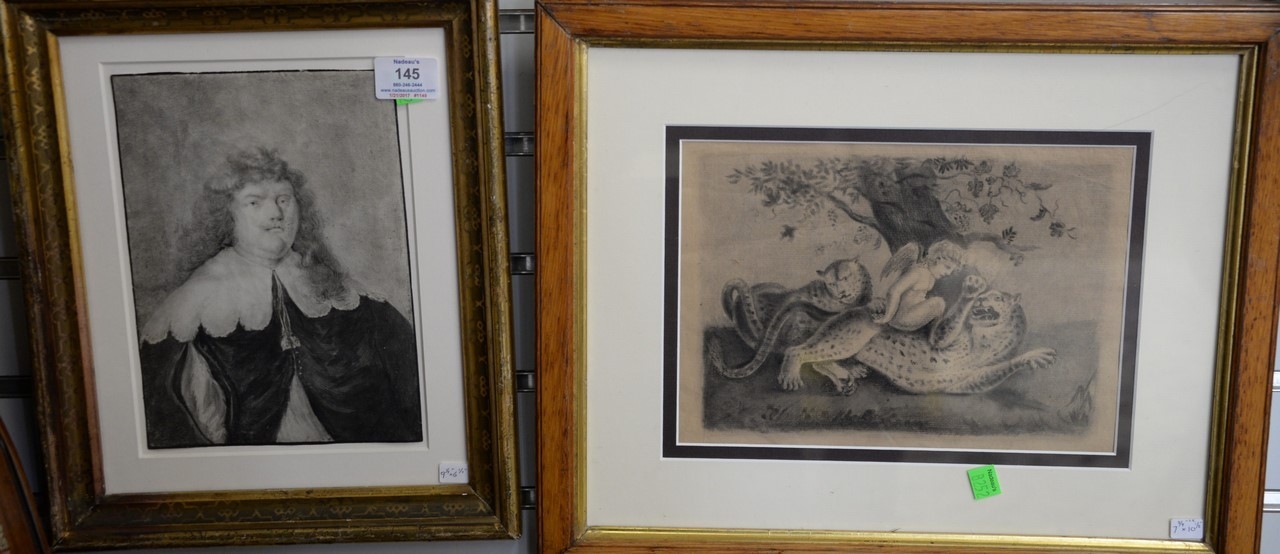 Large group to include a 20th century primitive style painting with two dogs 35 x 48 and a large group of tole and tinware to include three candlesticks, pair of tin sconces, tin table lamp with brass embossed lamp shade and brass embossed umbrella stand, two carved pieces ht. 10 1/2in., and a New York 2 gallon stoneware crock with blue decoration shipped ht. 9 1/2in., dia. 10in.