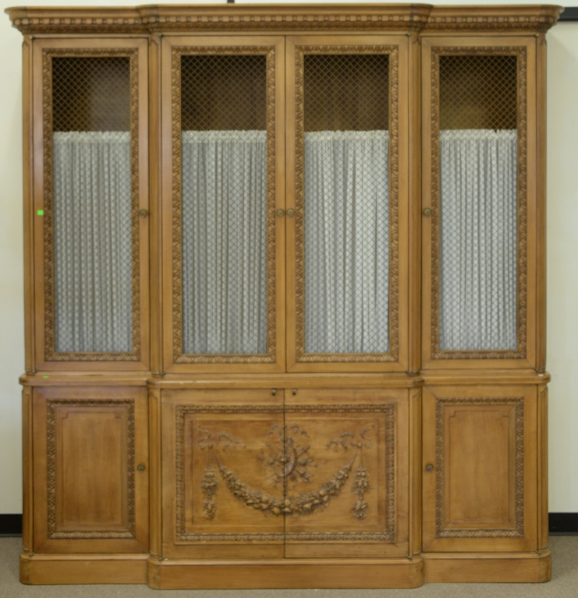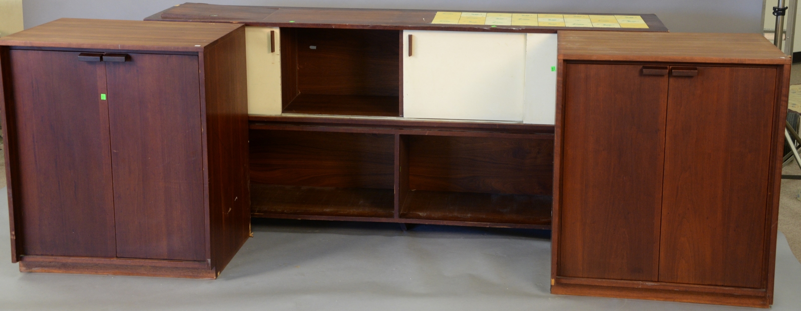 Group lot to include a contemporary teak queen sized bed with two night tables and attached double lift top chests and a pair of Scandinavian cabinets, each with tambour doors and interior drawers and shelves. ht. 34in., wd. 56in., dp. 18in.